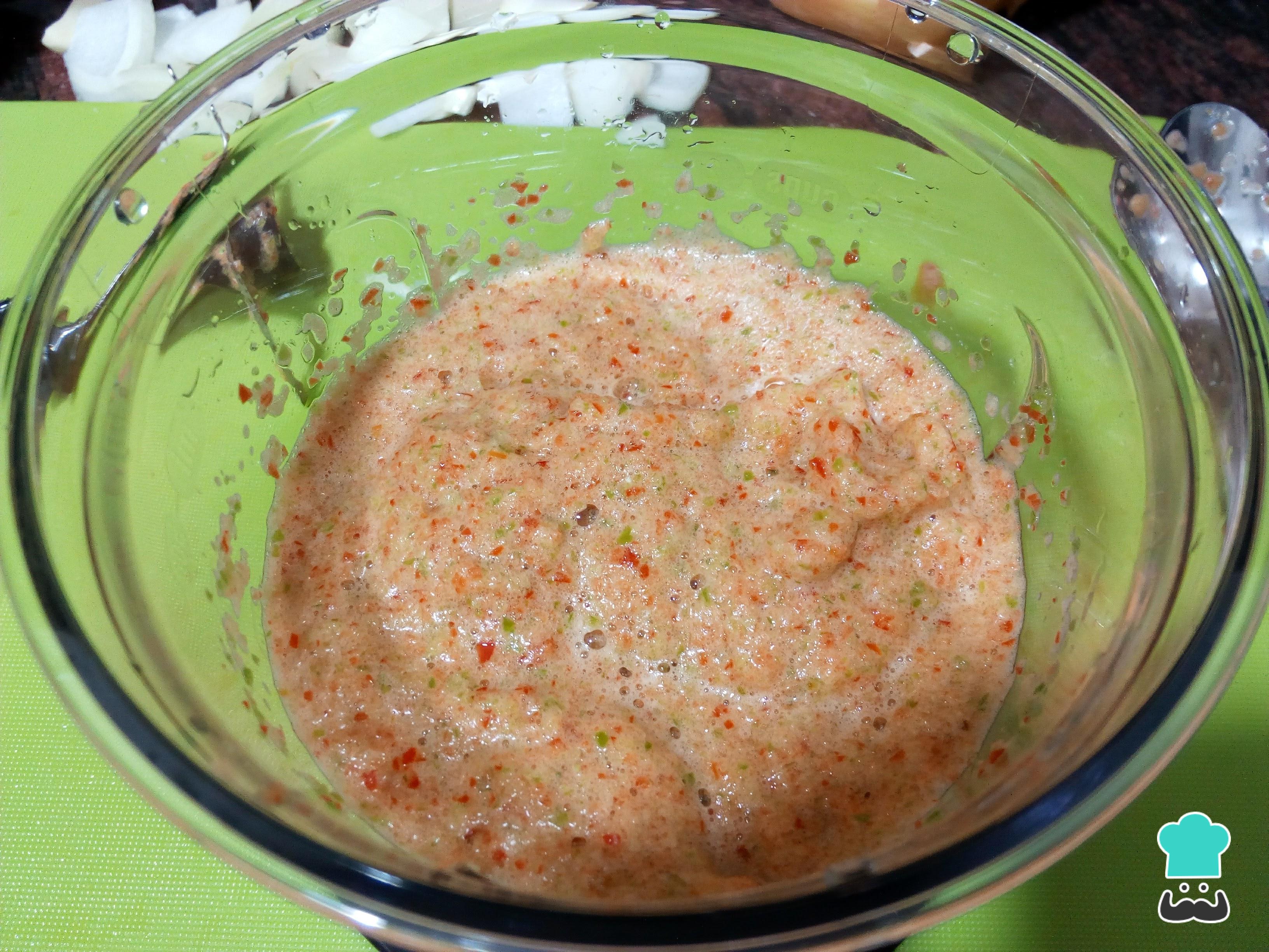 A continaución, lavamos y cortamos los pimientos en trocitos, pelamos y cortamos un poco la cebolla, pelamos también los ajos, y lo trituramos todo con ayuda de una picadora o un túrmix. Este será el sofrito de nuestras lentejas de bote con arroz y tomate así que si prefieres notar los trozos de verduras, tritúralas un poco menos.