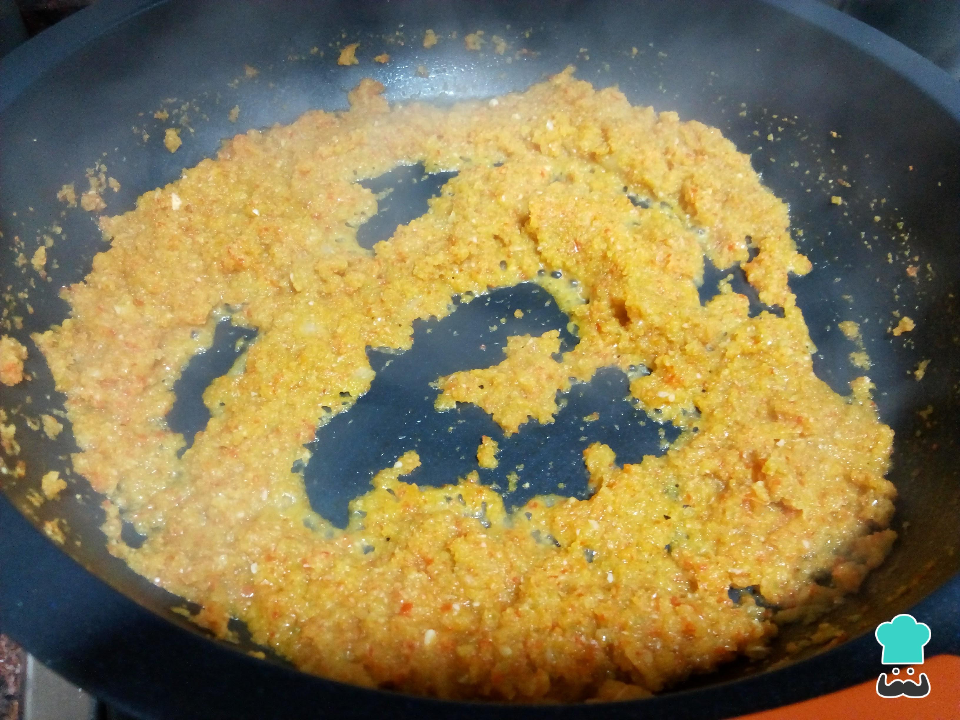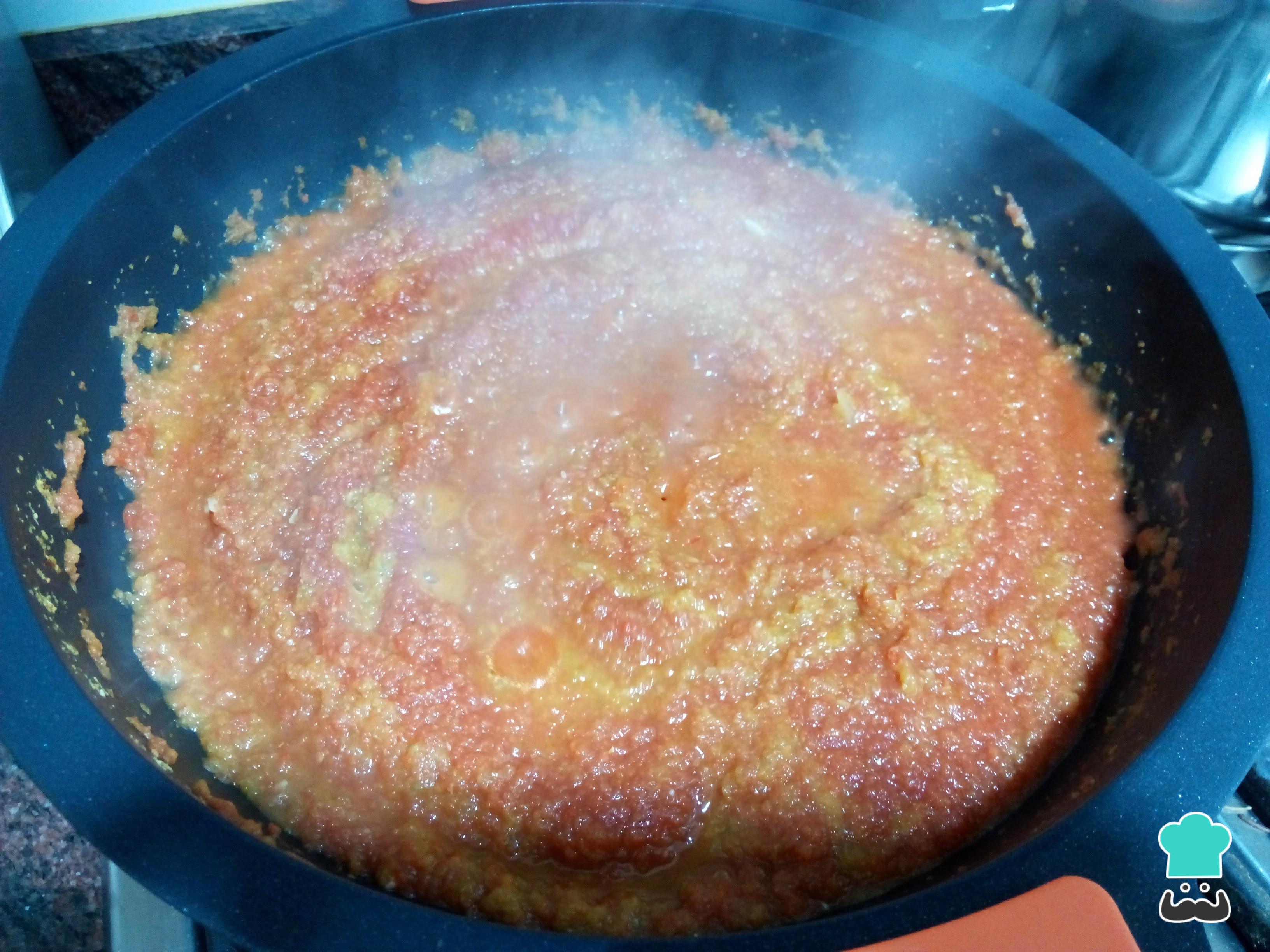 Luego echamos el sofrito en una cazuela con un poco de aceite y dejamos que se poche unos minutos.