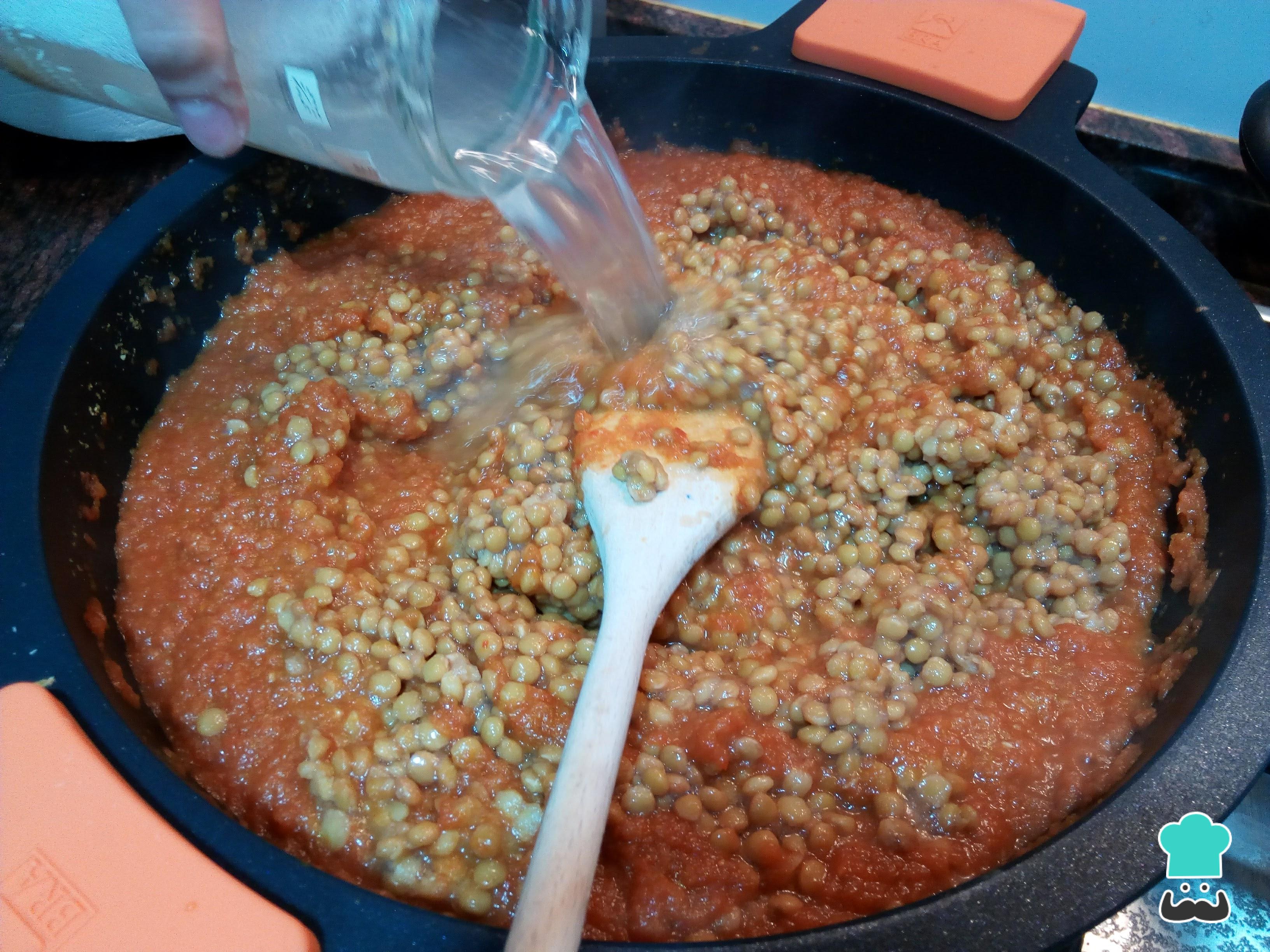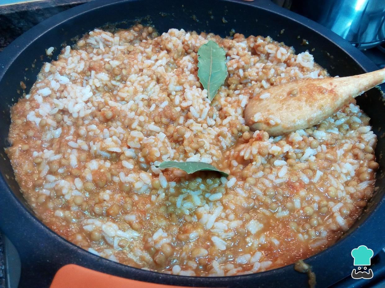 Una vez esté hecho el sofrito de las lentejas con arroz y tomate, echamos el bote de lentejas cocidas y un poco de agua, mezclamos bien, y dejamos que se cocine todo unos minutos.