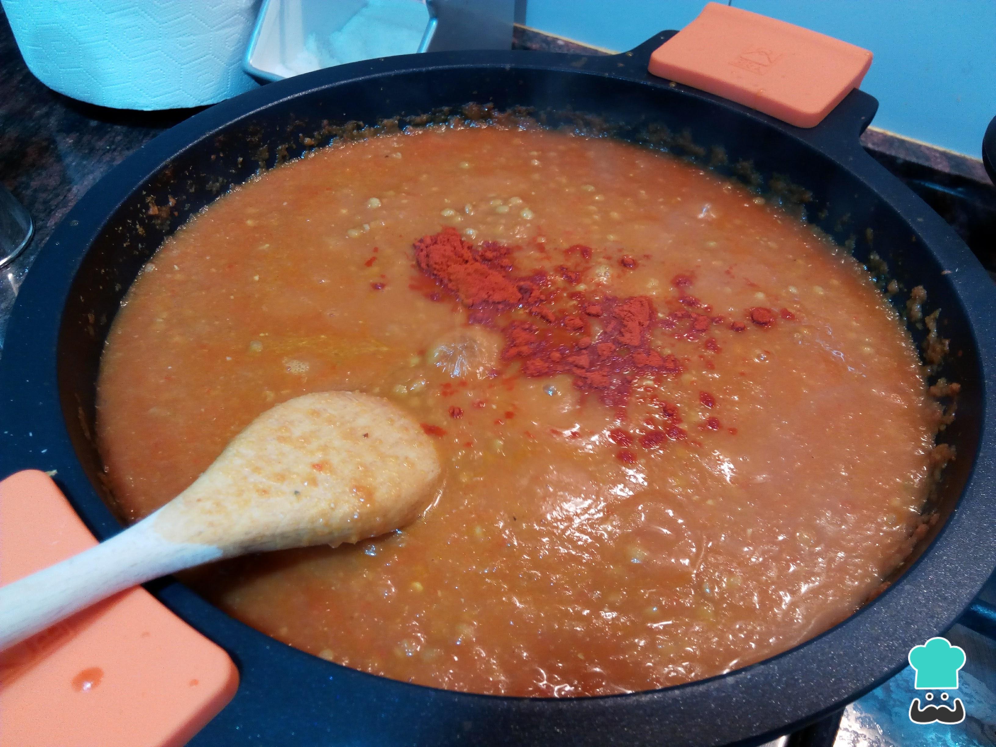 A continuación, echamos el pimentón dulce a las lentejas estofadas y removemos de nuevo para darle un toque de sabor extra.