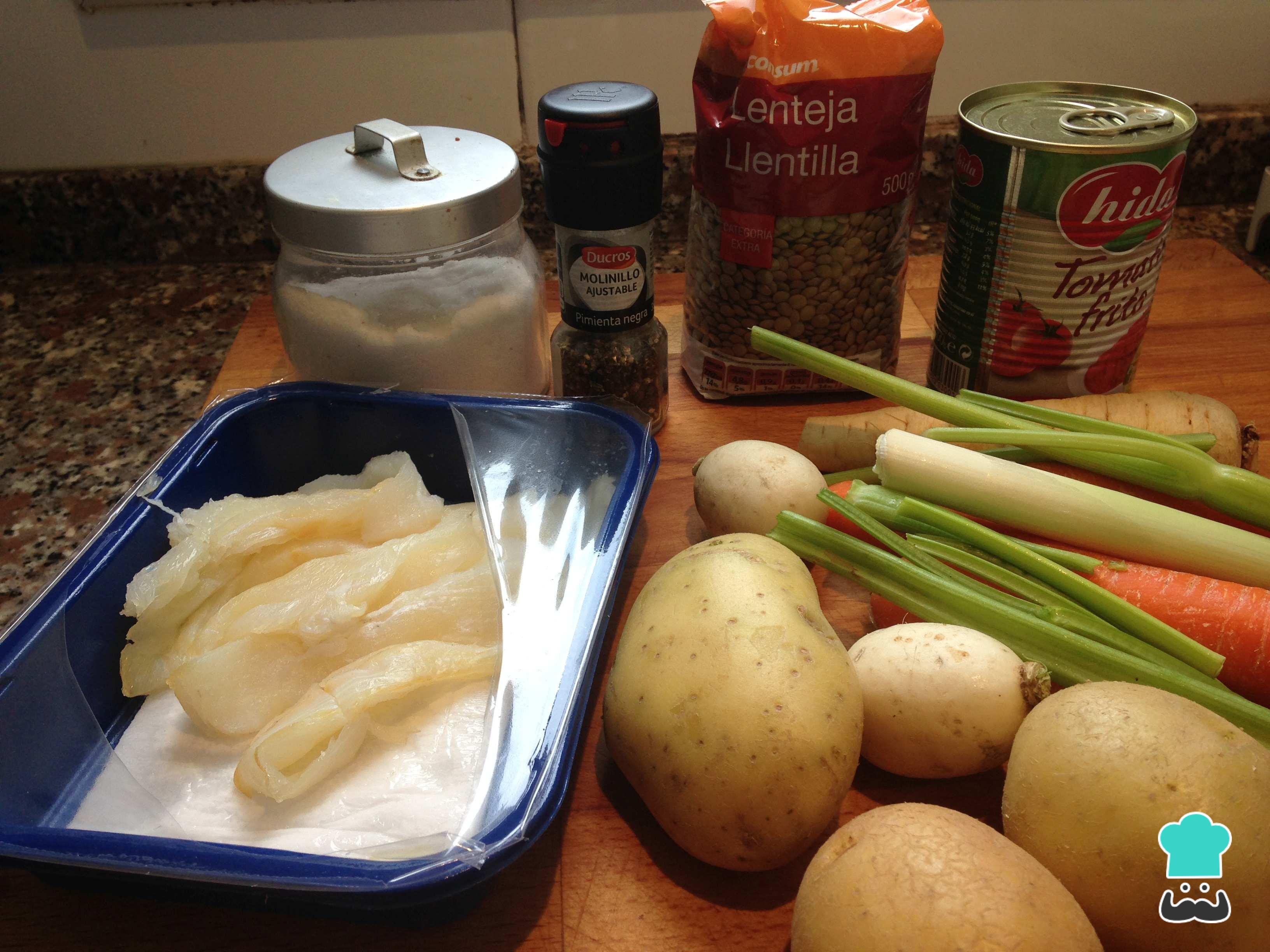 Preparamos los ingredientes para esta receta baja en calorías, basada en lentejas, bacalao y verduras. El bacalao lo hemos comprado ya desalado. Las verduras podemos variarlas en función de nuestros gustos.