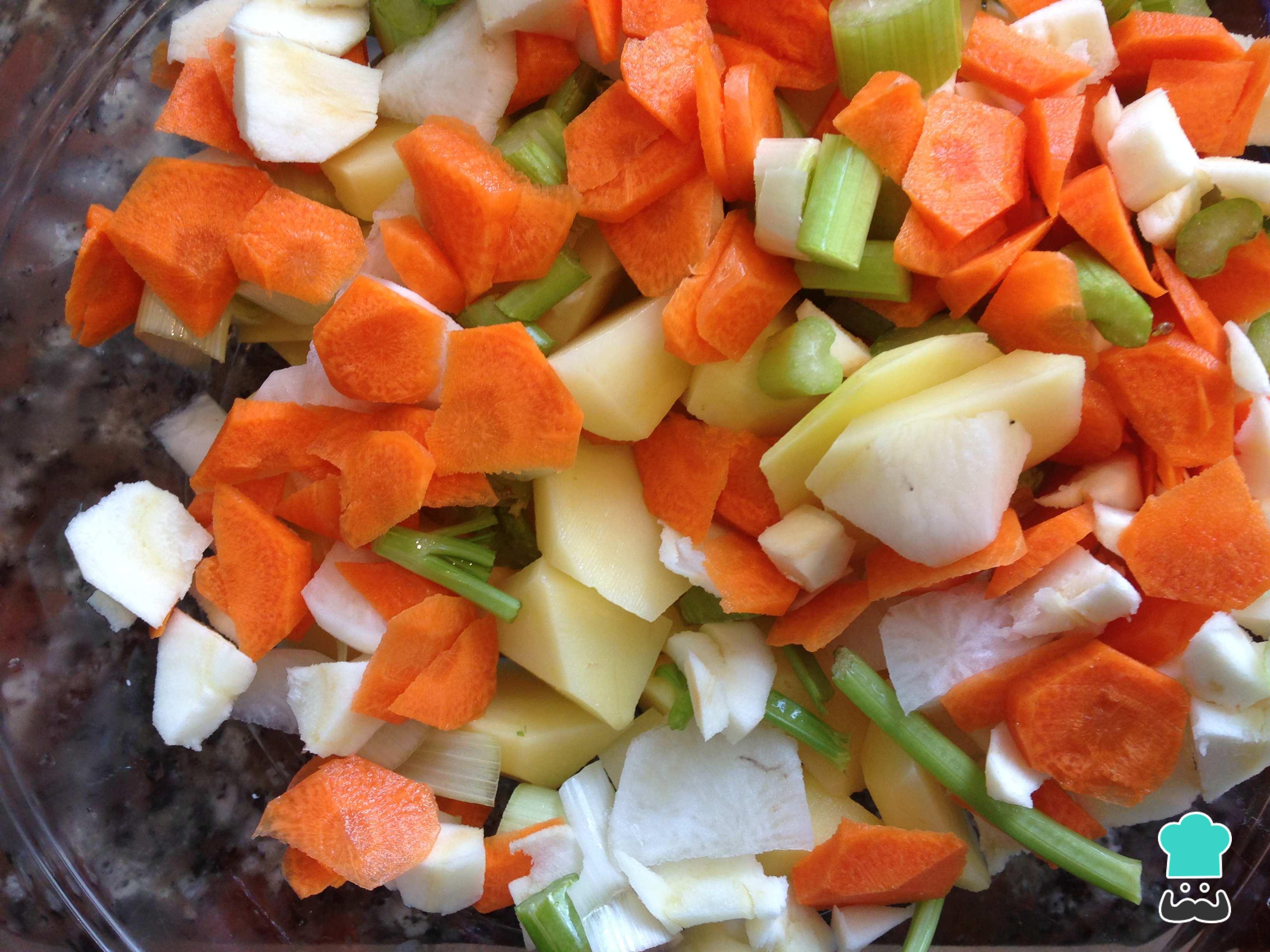 Mientras, lavamos, pelamos y troceamos todas las verduras.