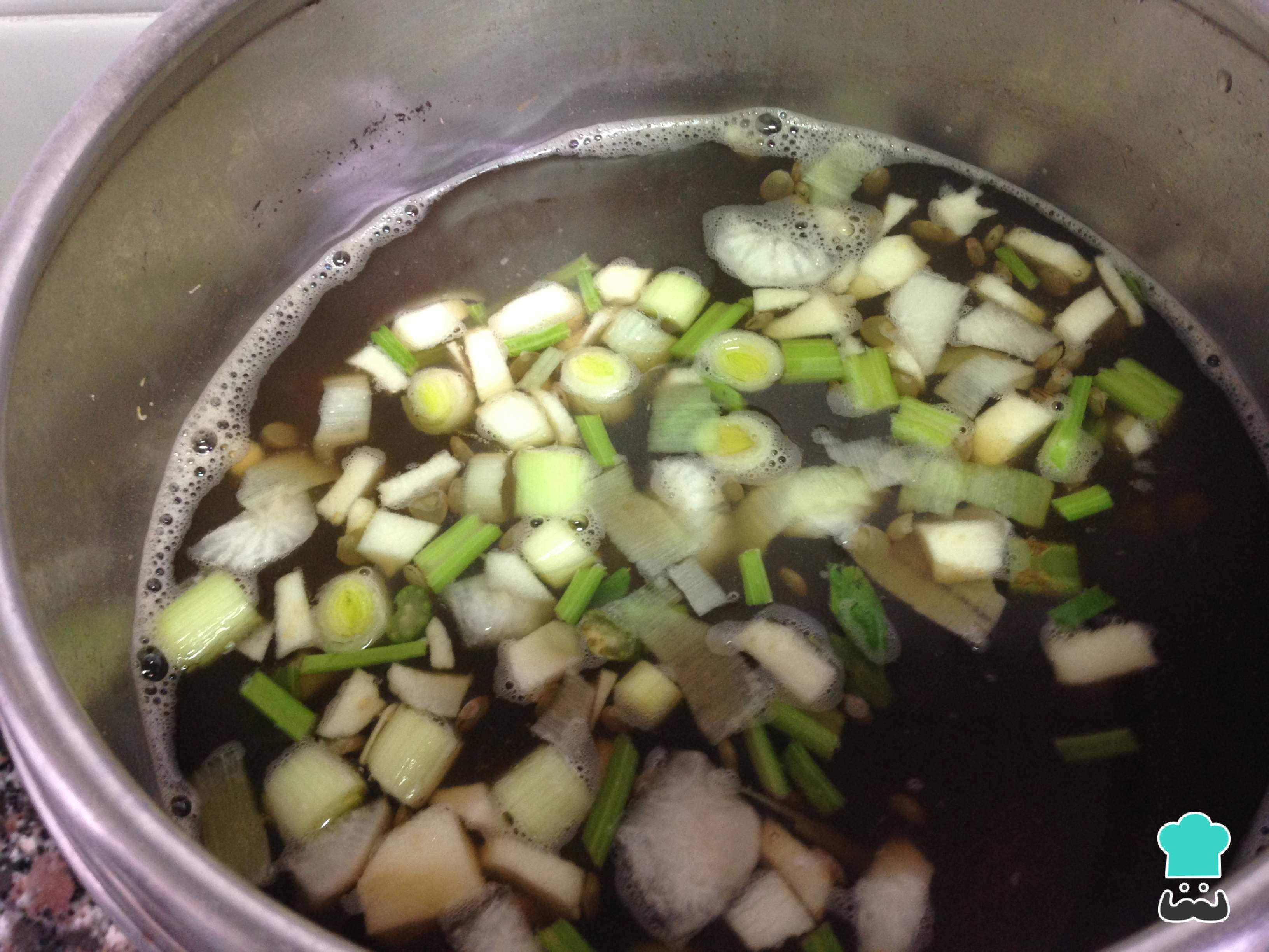 En una olla grande con bastante agua ponemos a cocer las lentejas. Antes de añadir las verduras las dejaremos hervir durante 20 minutos.