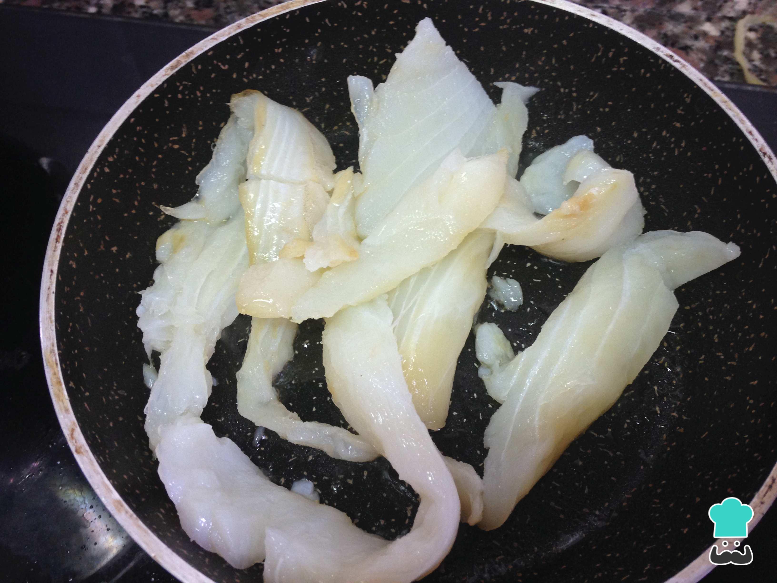 En una sartén saltearemos el bacalao con un poco de aceite. En unos minutos estará hecho.