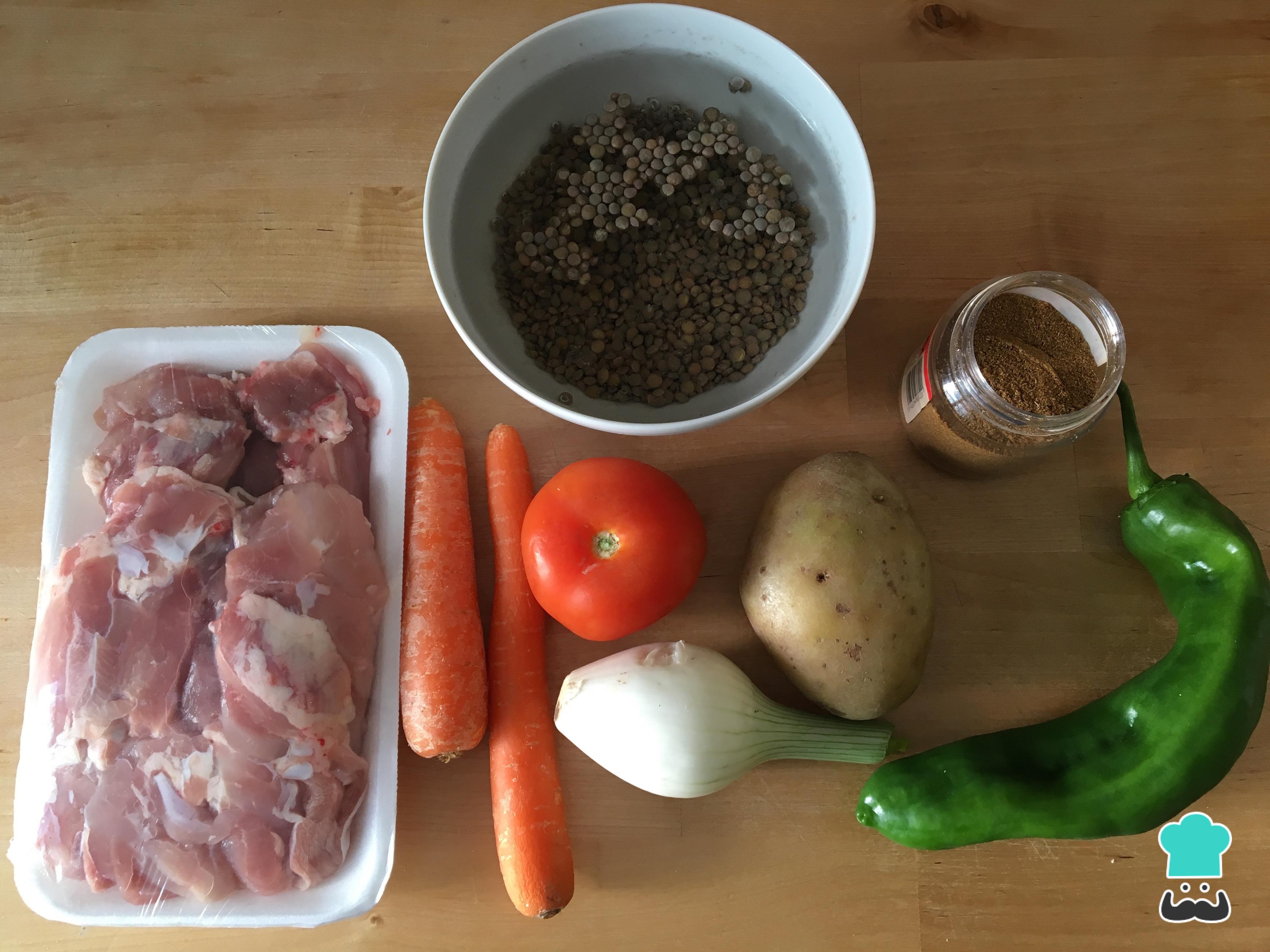 Reunimos todos los ingredientes para preparar las lentejas con verduras y pollo.