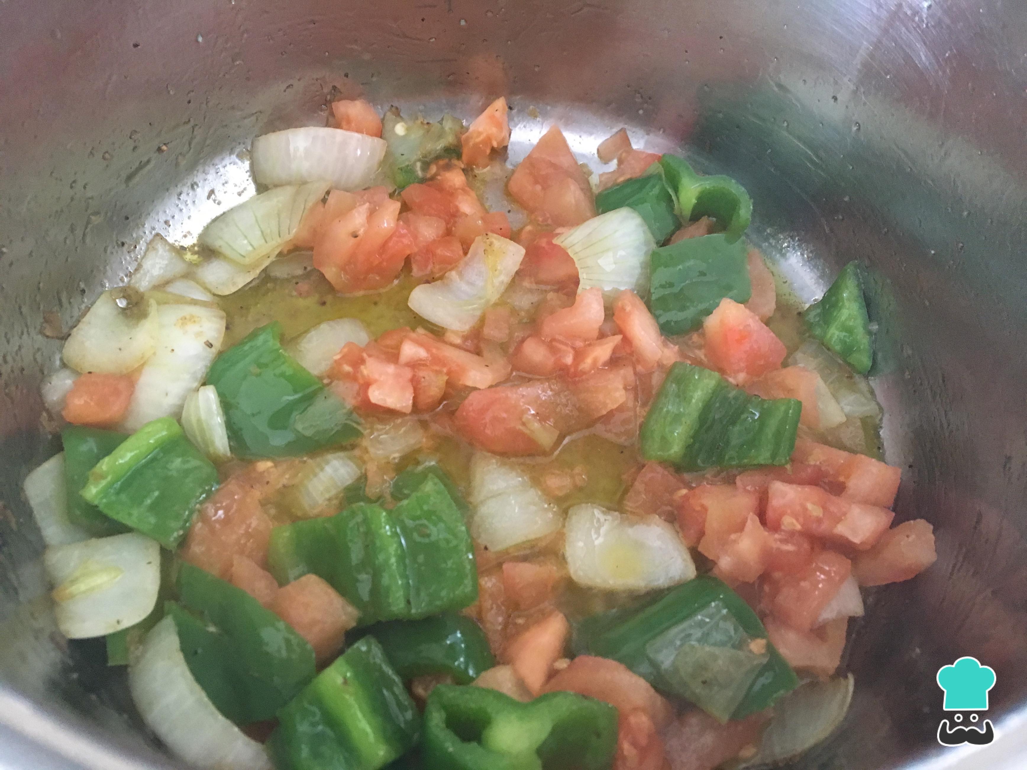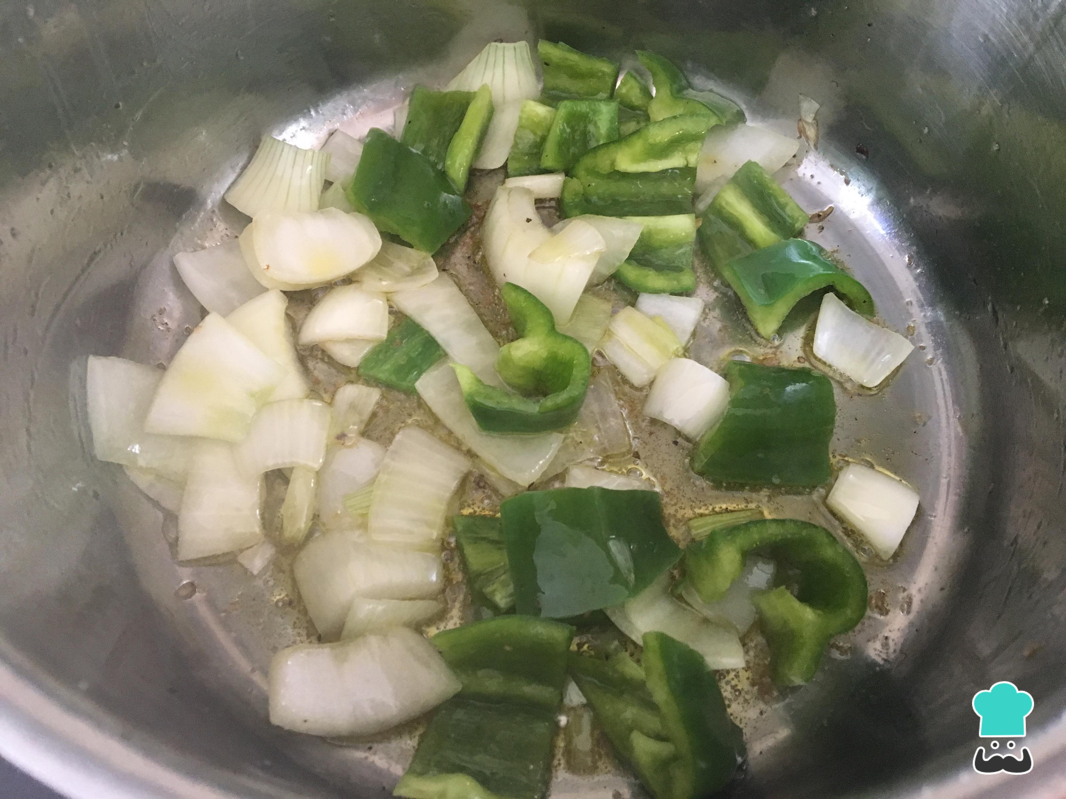 En la misma olla, sofreímos la cebolla y el pimiento cortados en trozos medianos. Dejamos que se cocinen durante 4 minutos y seguimos con la receta de lentejas con mulsos de pollo.