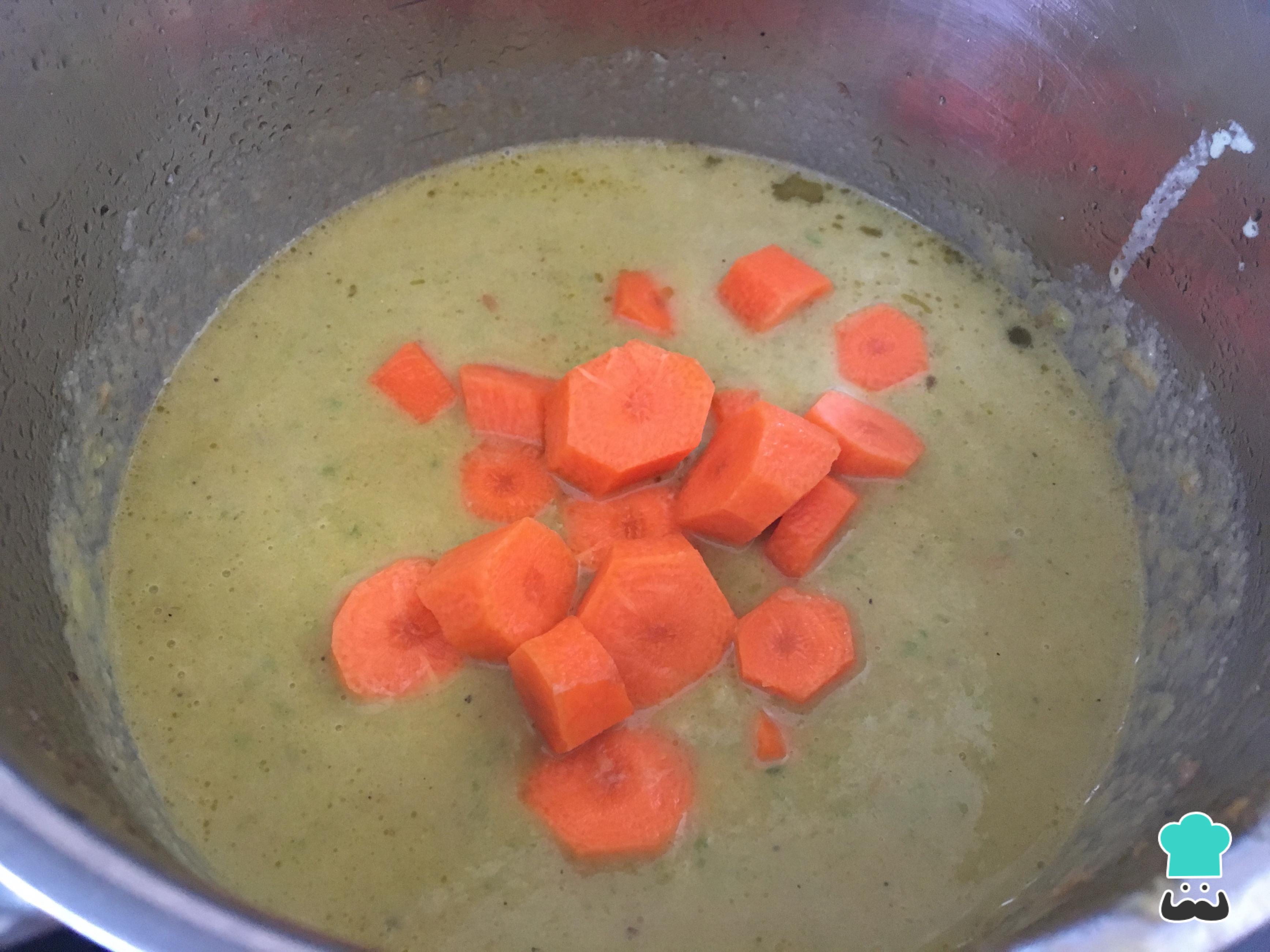 Pasamos las verduras por la batidora agregando un poco de agua y las volvemos a poner en la olla. Agregamos las zanahorias peladas u cortadas en rodajas.
