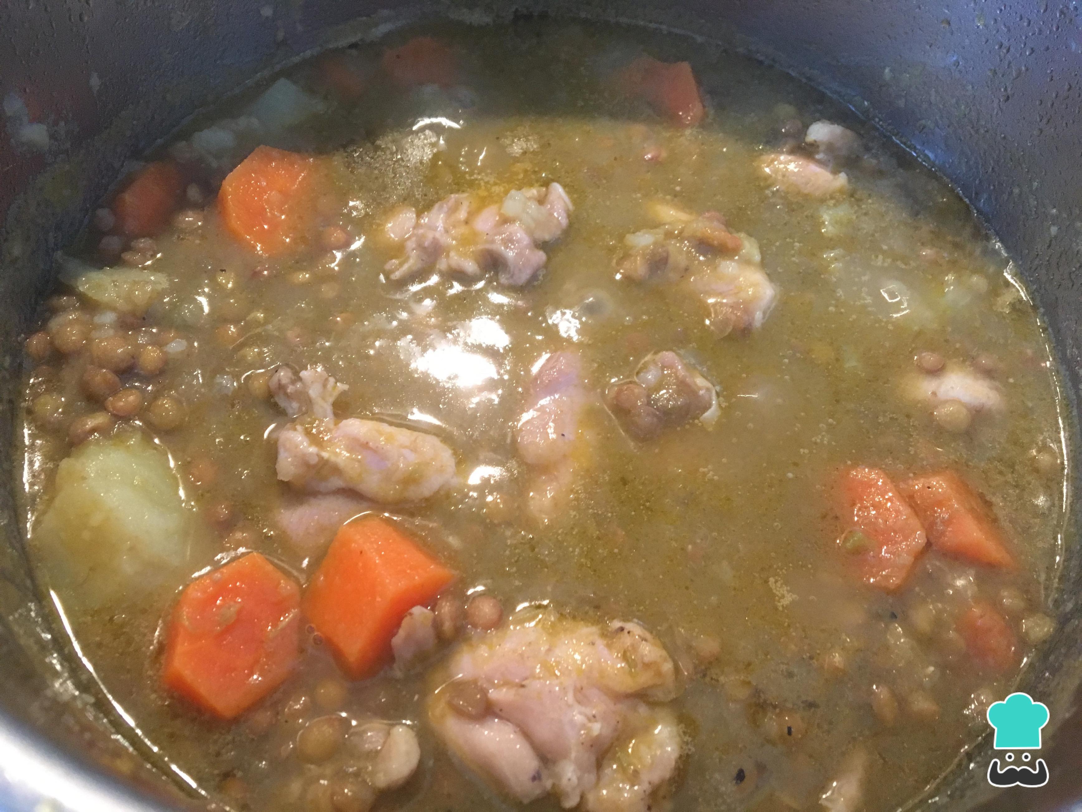 Incorporamos el pollo y dejamos que hierva durante 10 minutos más. Ya queda poco para poder disfrutar de este delicioso plato de lentejas con muslos de pollo y ofrecer a los más pequeños una comida completa.