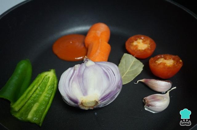 En la olla donde vayamos a prepararlas, ponemos todos los ingredientes en crudo limpios y cortados, menos el jamón y el chorizo.
