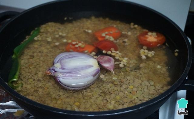 Acto seguido, introducimos las lentejas y las cubrimos con agua. Ponemos la olla a fuego fuerte hasta que empiece a hervir.