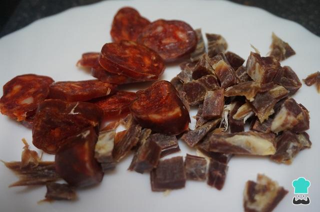 Cortamos el chorizo en trozos pequeños y el jamón, aunque si lo preferimos también podemos poner estos productos enteros.
