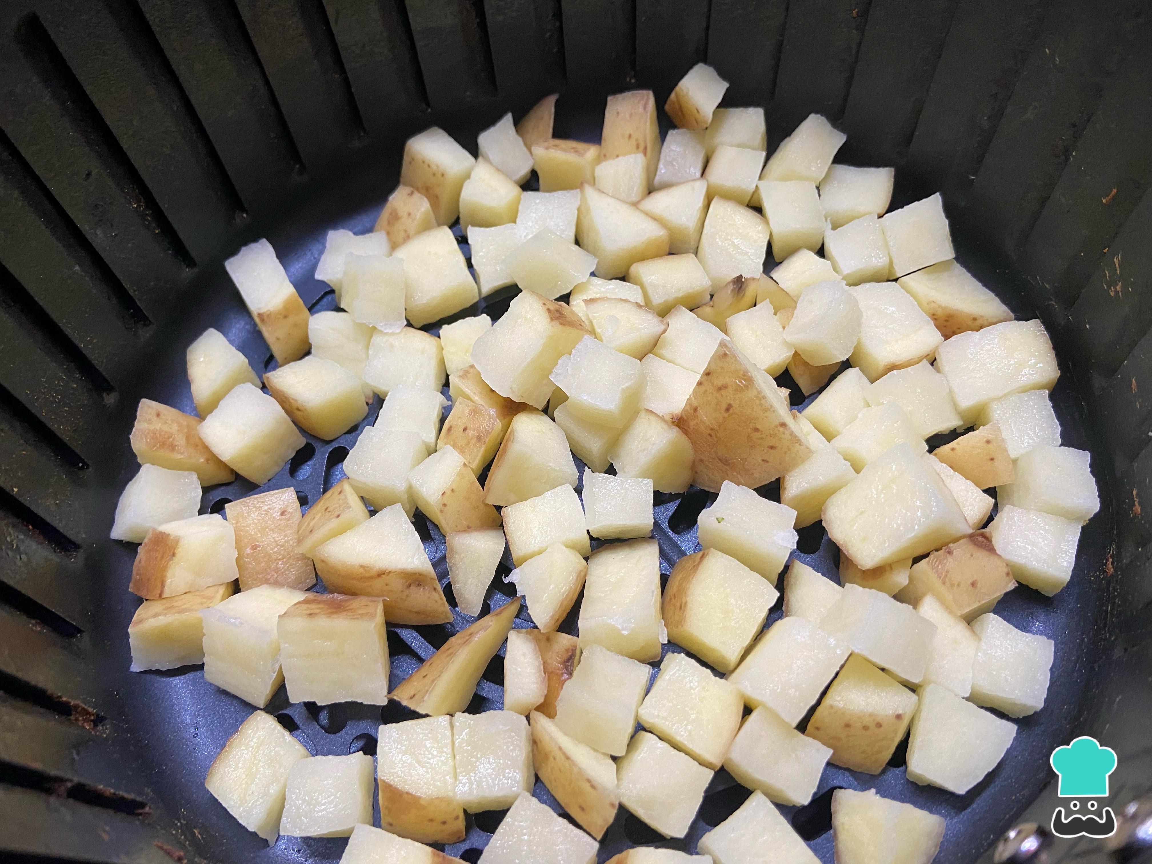 Lava la segunda papa y córtala en cubos pequeños. A continuación, llévala a la freidora de aire a 200 ºC durante 12 minutos para que queden doradas y crocantes. Si no tienes freidora, puedes hacerlas en el horno, freírlas o, simplemente, utilizar todas las papas en el primer paso. Aquí solo buscamos darle una segunda textura muy rica al locro, combinando la cremosidad de las papas cocidas con agua y leche, con el crujiente de las papas fritas.