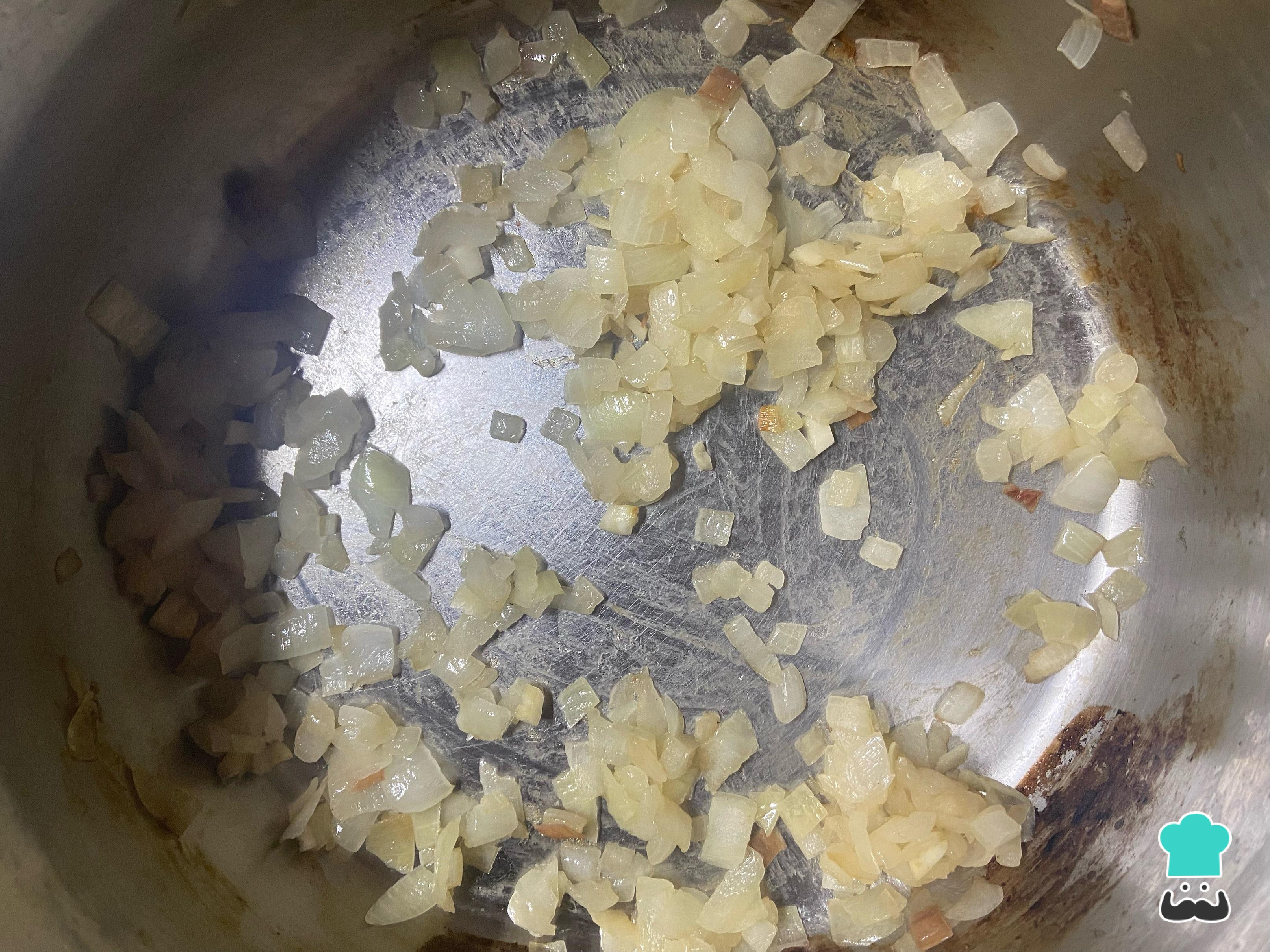Pela y pica la cebolla para saltearla en una olla con 1 cucharadita de aceite y el fuego medio. En este caso, utilizamos solo 1 cucharadita de aceite para hacer una versión saludable, sin embargo, si lo deseas, puedes usar más aceite y/o reemplazarlo por manteca.