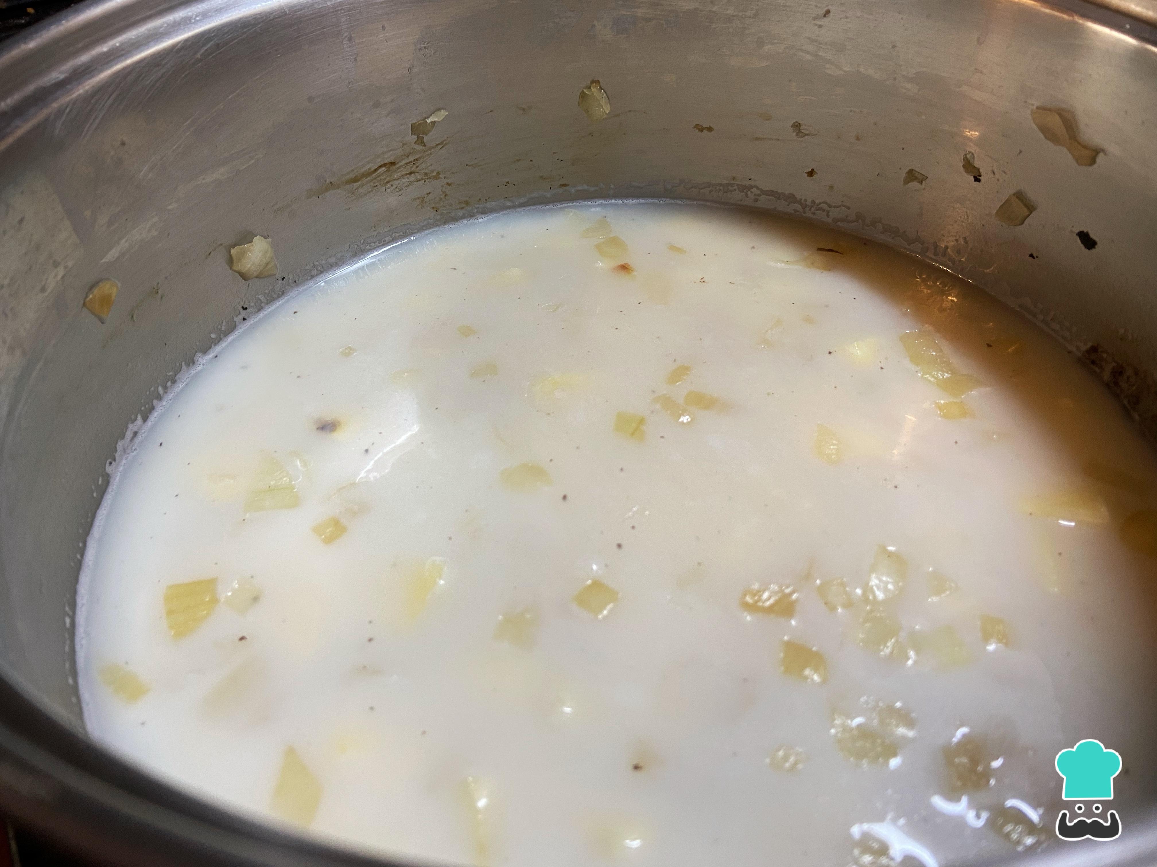 Cuando la cebolla esté transparente, agrega las papas que habías cortado junto con el agua en remojo, donde hay una gran parte del almidón, ideal para hacer un locro cremoso. También añade la leche y los condimentos.