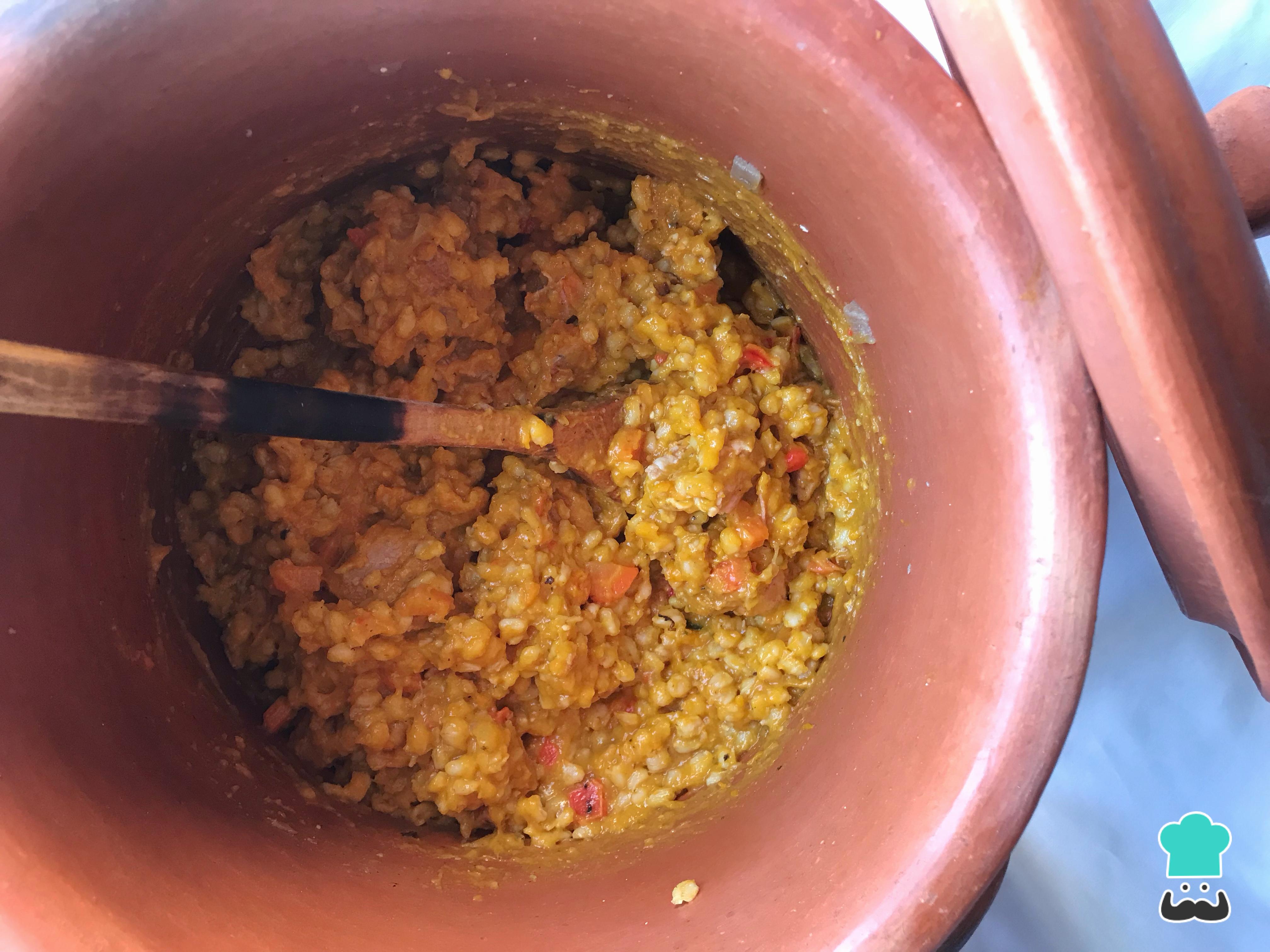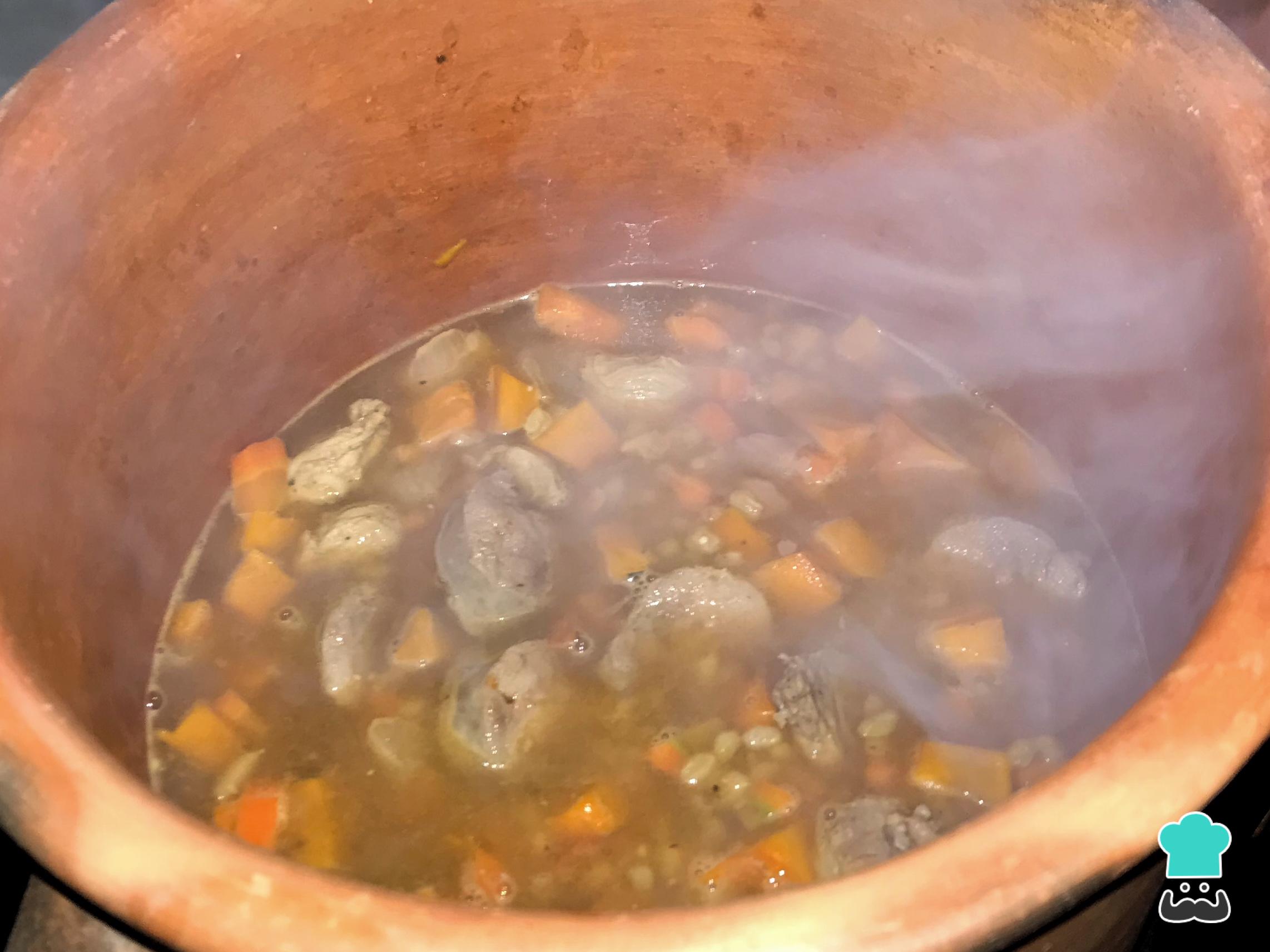 Agrega al salteado el chorizo cortado, el trigo, el zapallo pelado y cortado en cubos, los condimentos y cubre toda tu preparación con agua hirviendo. Baja el fuego, tápalo y cocínalo 1 hora revolviéndolo cada tanto para que no se pegue la preparación en el fondo y corroborar que no se quede sin agua. Si esto sucede, agrega más agua, siempre caliente.