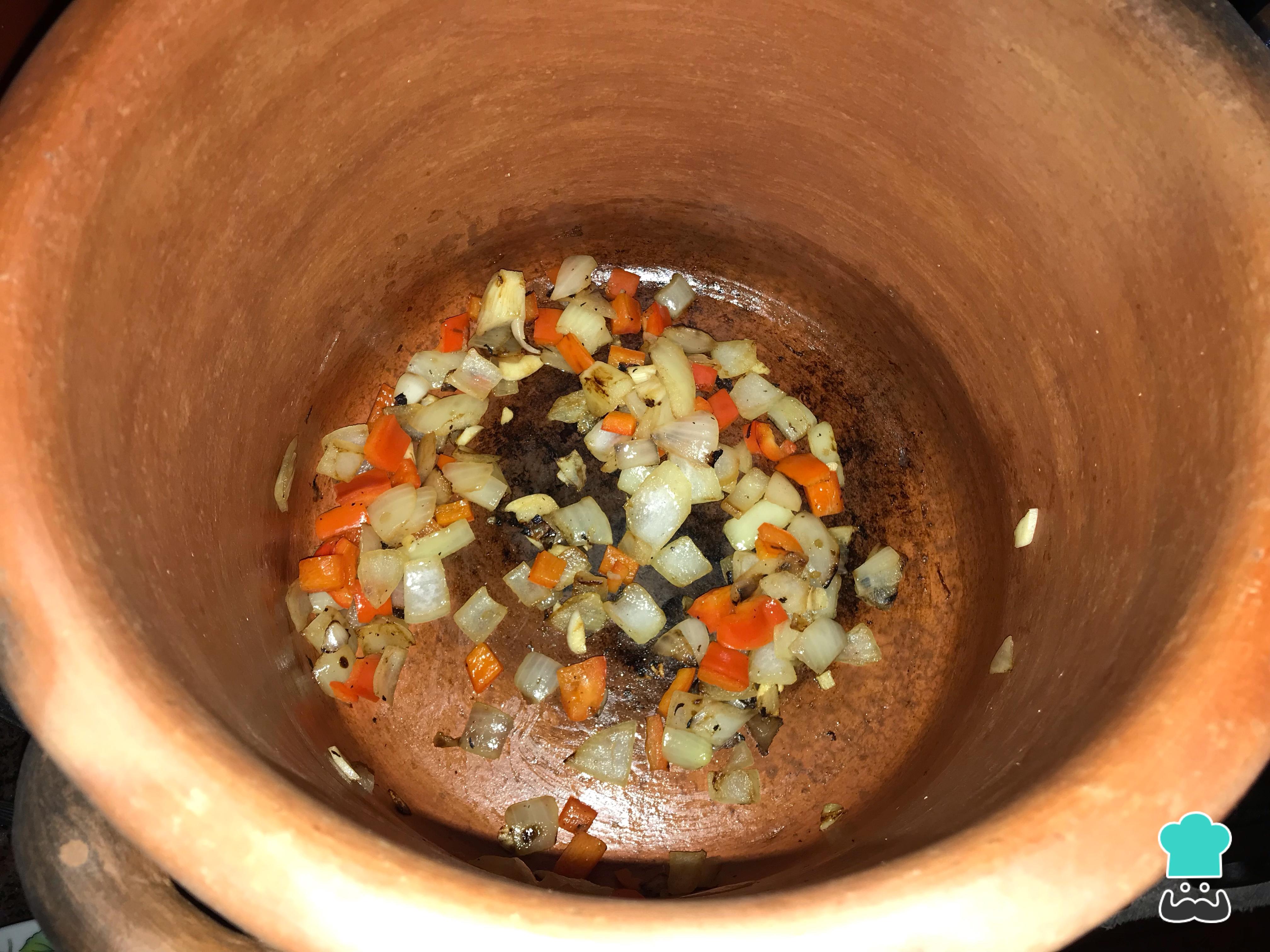 Una vez dorada o transparente, agrega el pimiento morrón picado. Para esta receta de locro de trigo puedes escoger pimiento verde o rojo, ¡ambos son perfectos!