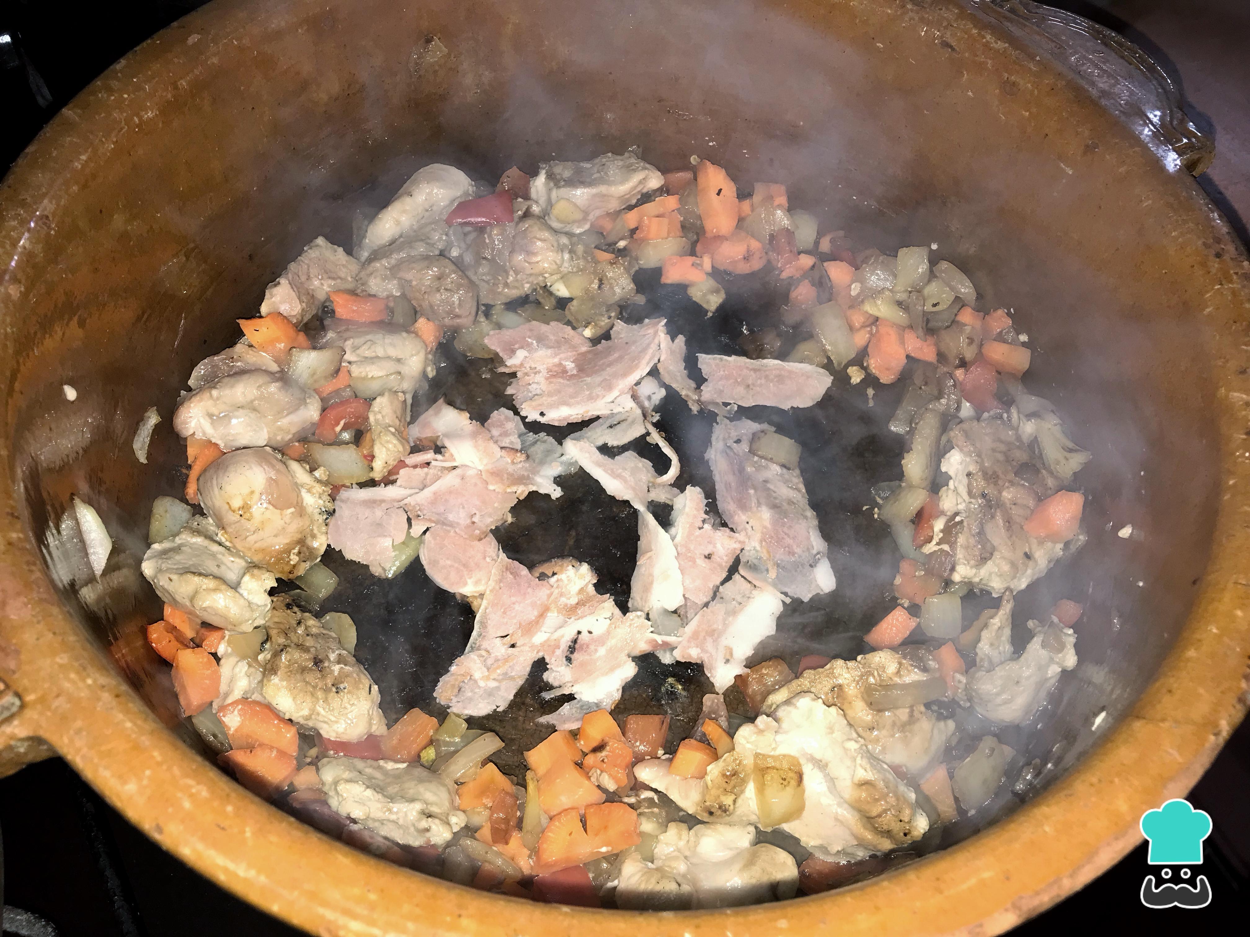 Cuando esté dorado el morrón, lleva los vegetales a los costados y en el centro agrega la zanahoria y la carne cortada en cubos. Sella la carne por todos sus lados y llévala a los bordes también. Repite el proceso con la panceta ahumada.