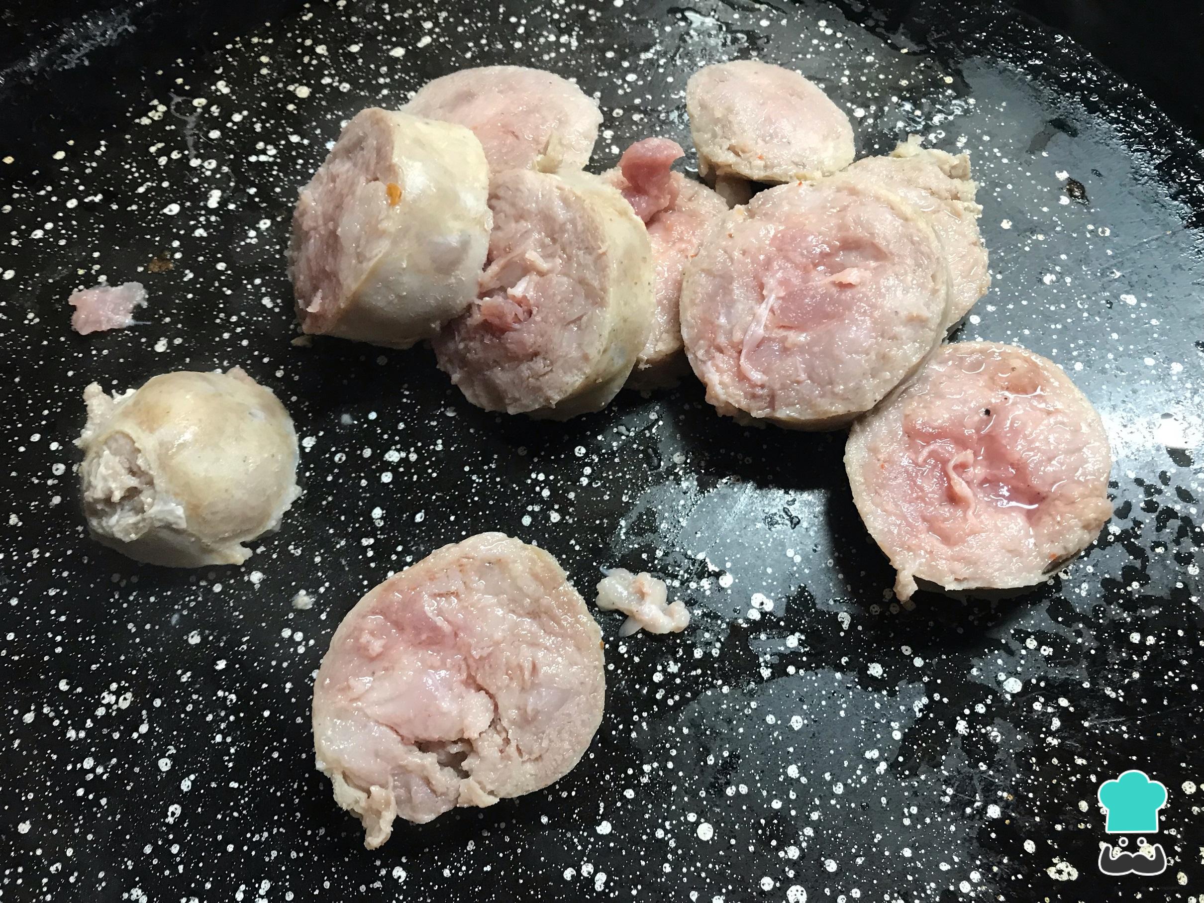 Mientras las carnes se doran, pincha y hierve el chorizo 5 minutos. Luego, córtalo en rodajas.