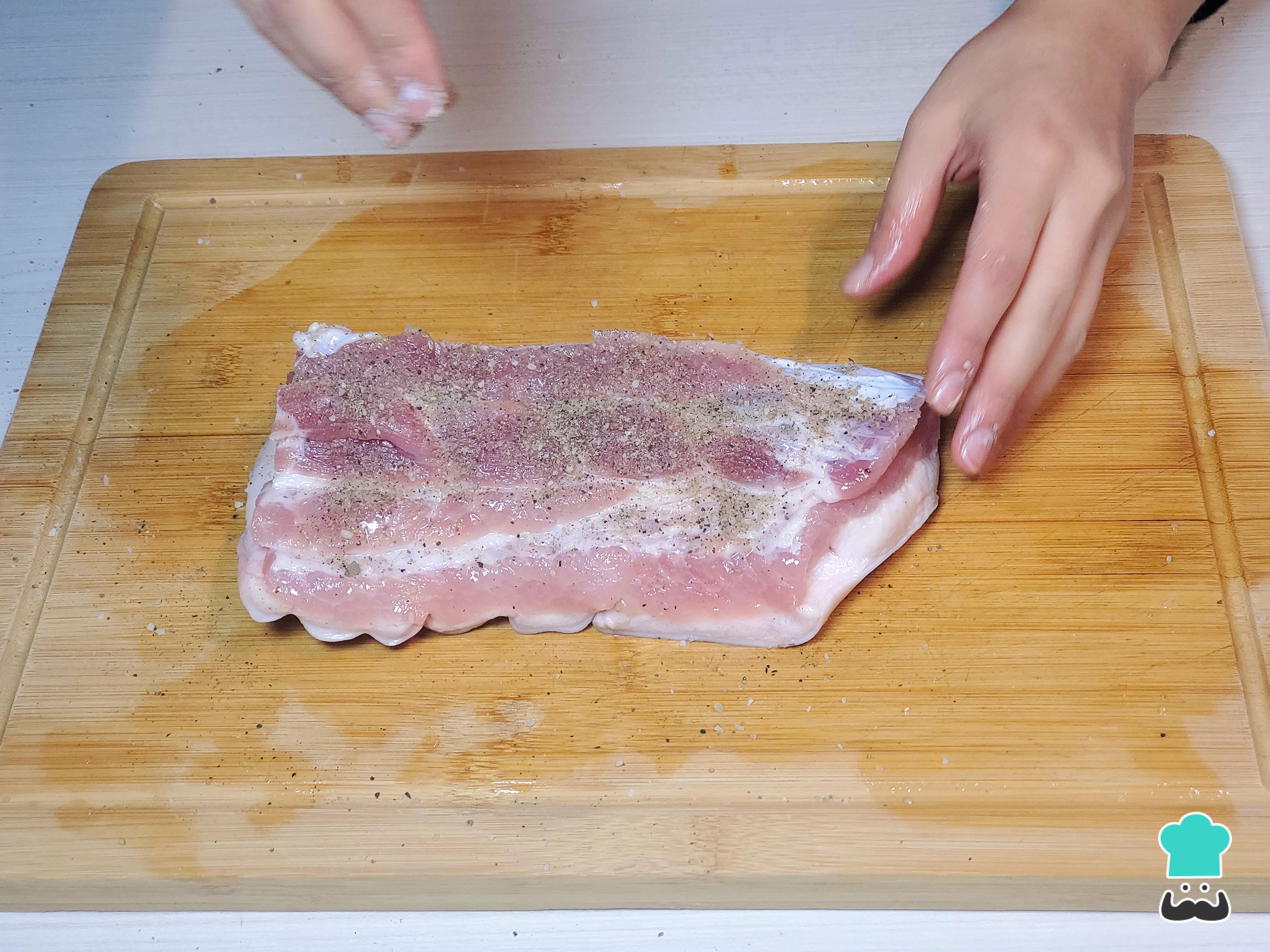 Limpia cuidadosamente la pieza de lomo de cerdo con naranja y córtala en 2 o 3 porciones de aproximadamente 20 centímetros de largo. Esto facilitará la cocción uniforme y reducirá el tiempo de preparación. Salpimienta generosamente por todos los lados.