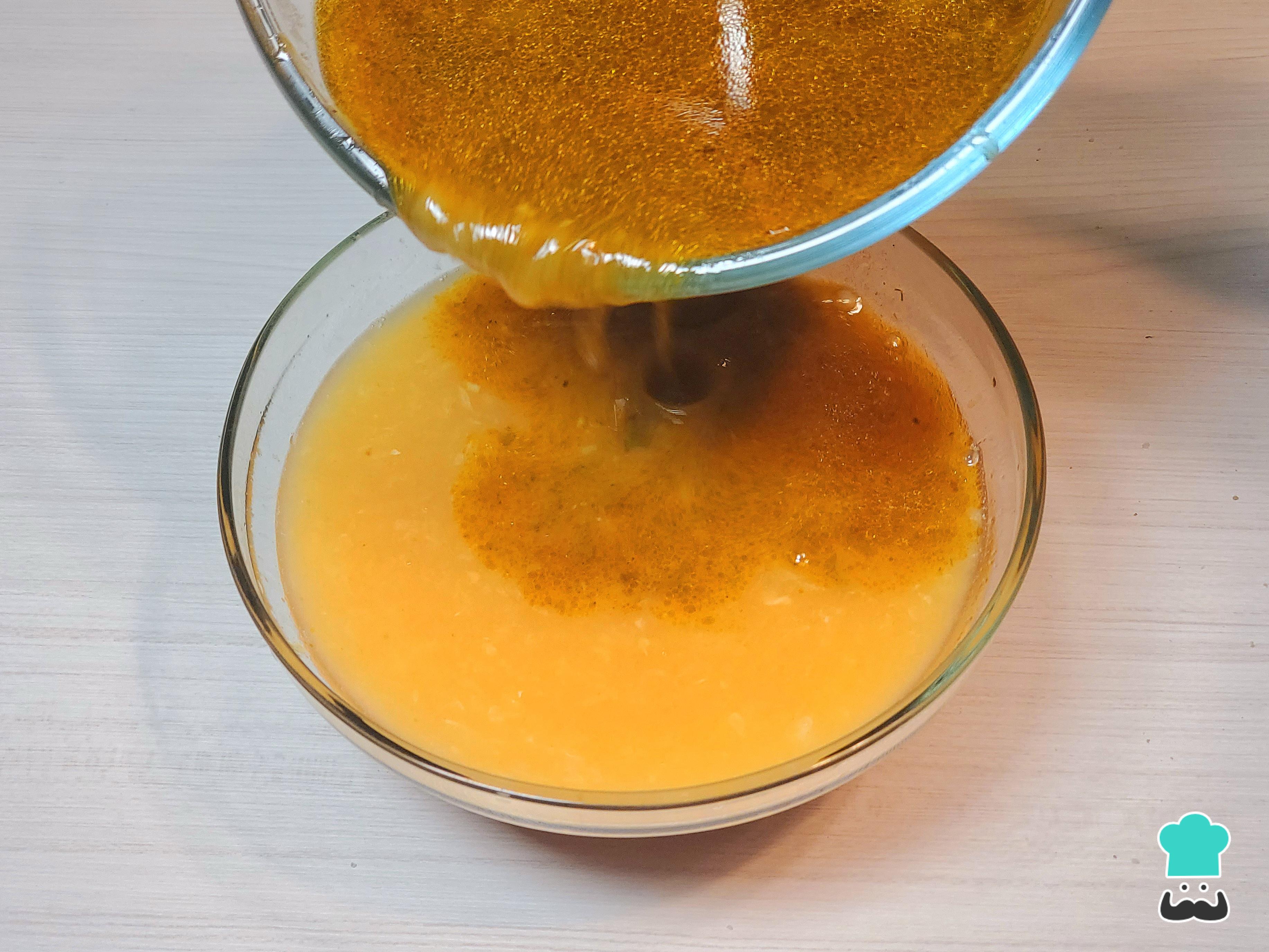 En un bowl grande, combina el ajo molido, caldo de carne, salsa de soya, azúcar, jugo de naranja recién exprimido, vino blanco y sal. Mezcla enérgicamente hasta que todos los ingredientes estén perfectamente integrados.