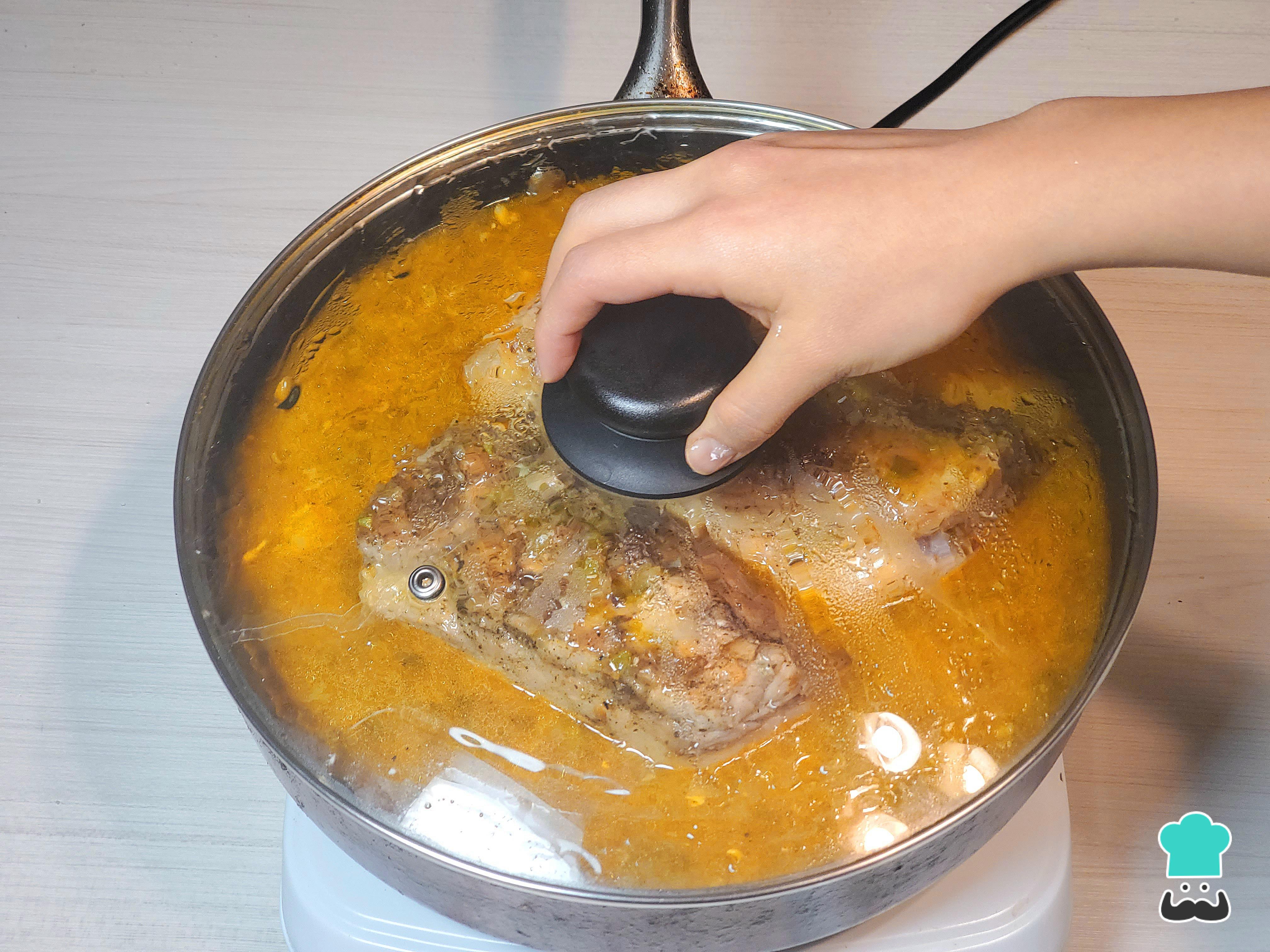 Tapa la olla y reduce el fuego a medio-bajo. Cocina durante 40-45 minutos o hasta que la carne esté completamente tierna. A media cocción, voltea cuidadosamente las piezas para garantizar una cocción uniforme por todos los lados.
