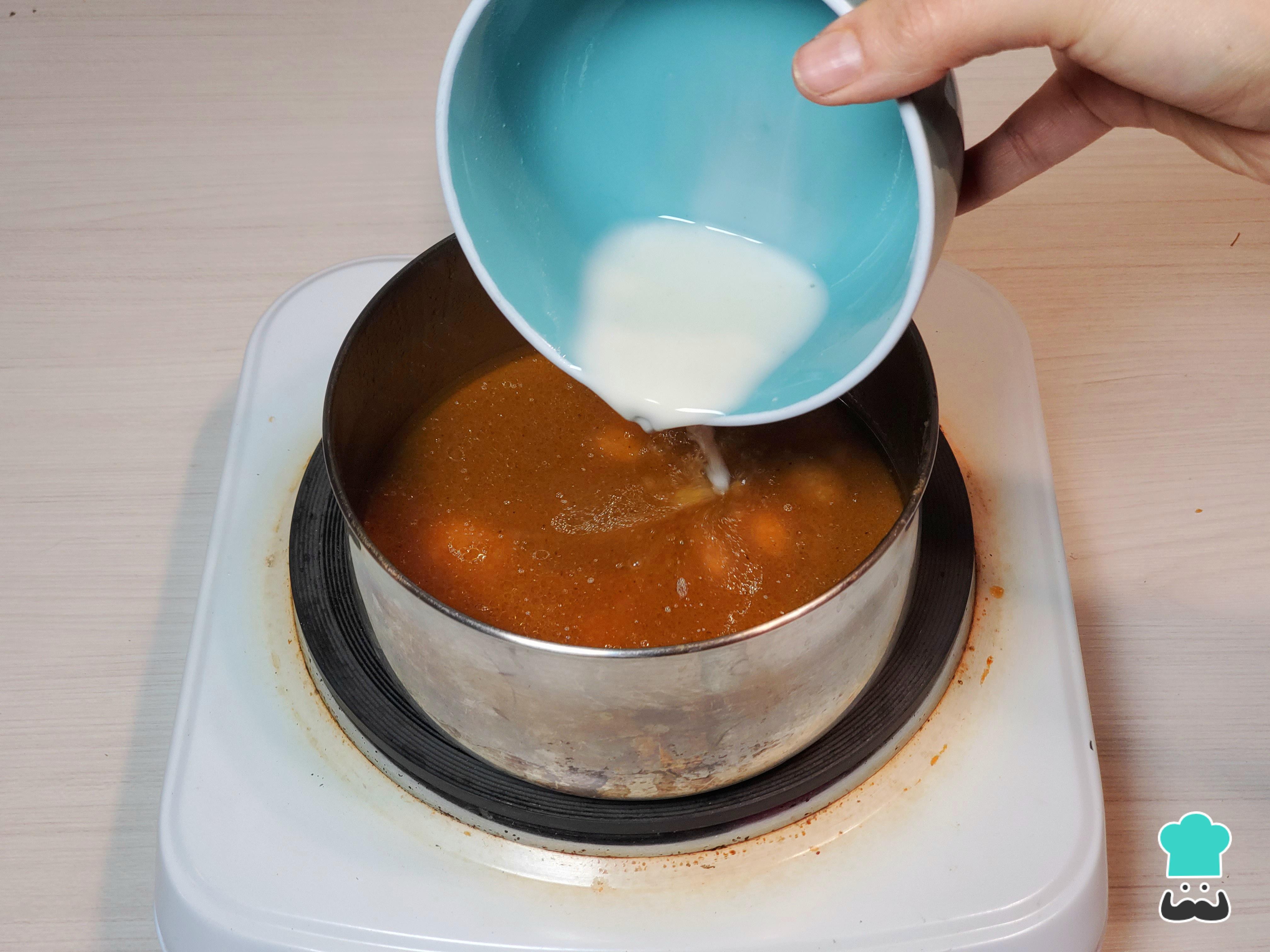 Vierte esta mezcla aromática en la misma sartén donde sellaste el lomo naranja, aprovechando los restos caramelizados del fondo. Remueve bien para desglasar y despegar todos los sabores concentrados. Regresa las piezas de cerdo a la olla.