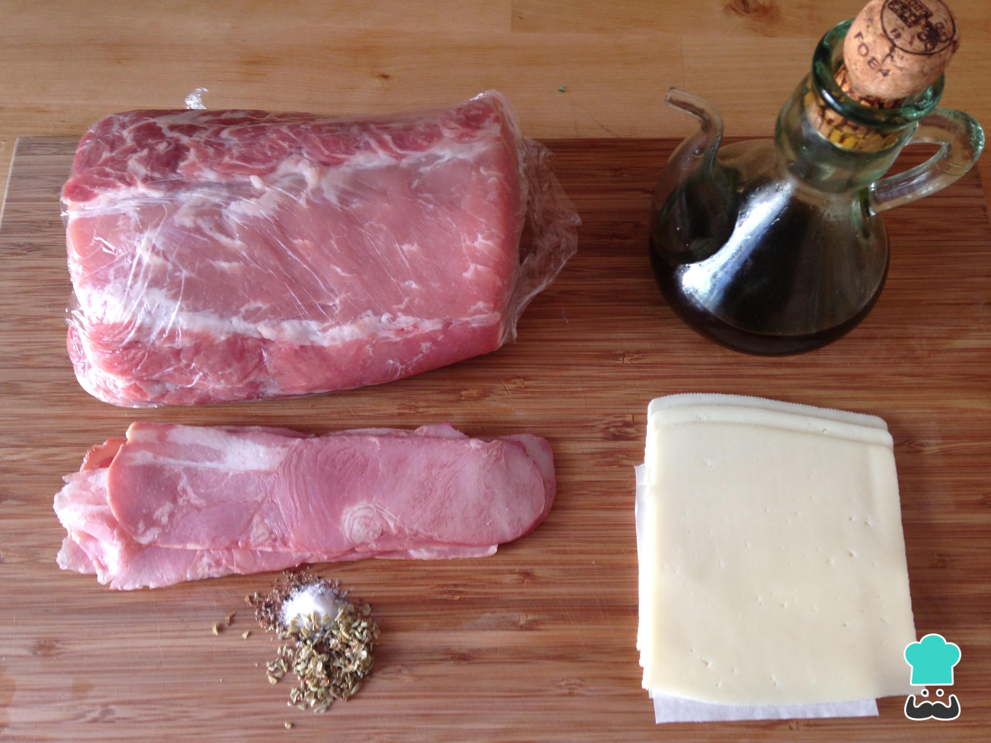 El primer paso para elaborar el lomo de cerdo relleno con beicon y queso es reunir todos los ingredientes.