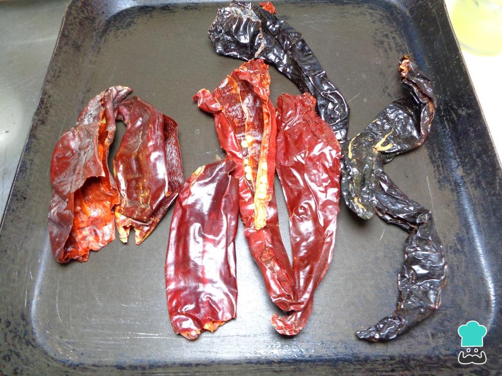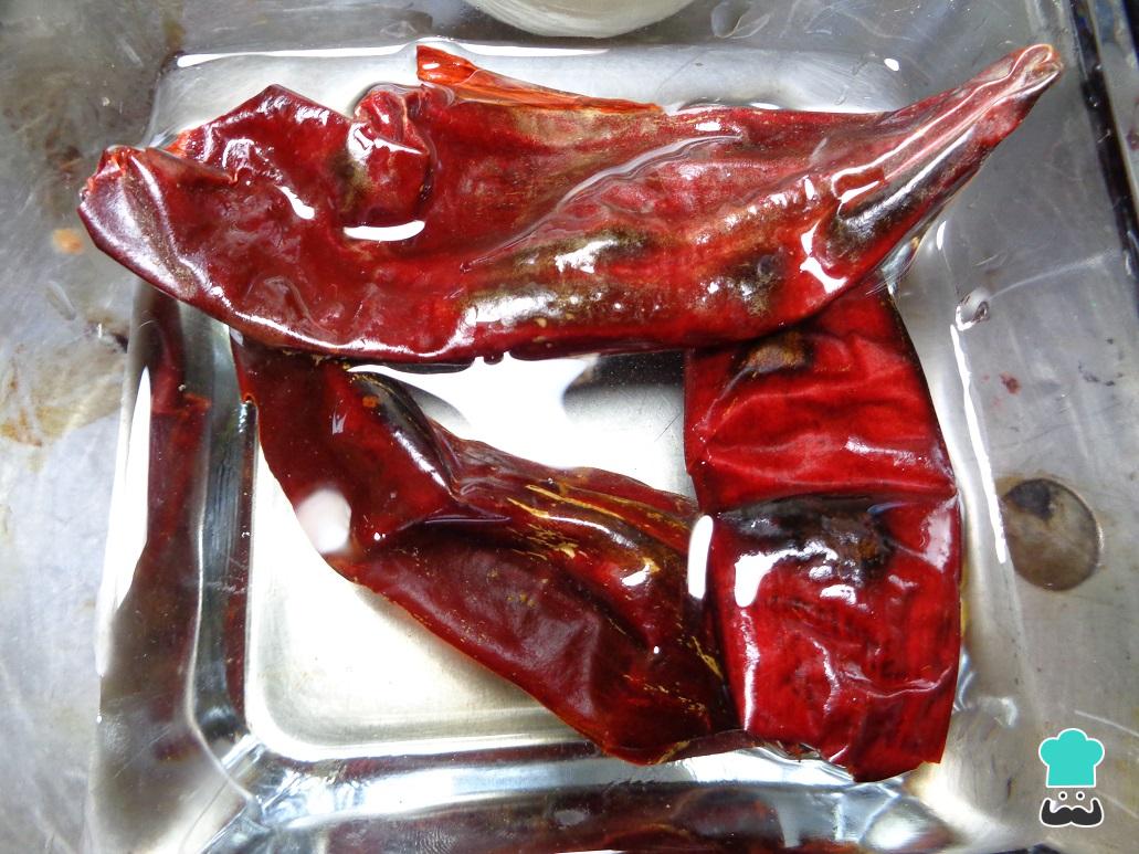 Ya que los chiles están dorados, los colocamos en un recipiente con agua y los dejamos remojar por aproximadamente 10 minutos para que queden suaves.