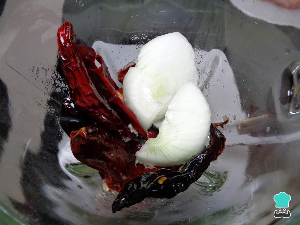 Licuamos los chiles junto con la cebolla, el jugo de limón, el jugo de naranja y el vinagre, agregamos sal al gusto para sazonar. Esta será nuestra salsa para el lomo relleno navideño.