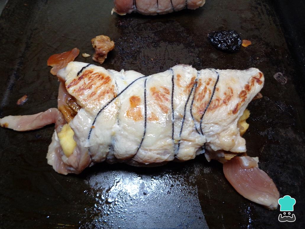 Enrollamos el lomo enchilado cuidando que la fruta no se salga y con ayuda de hilo cáñamo lo atamos para asegurarnos que mantenga su forma durante la cocción.