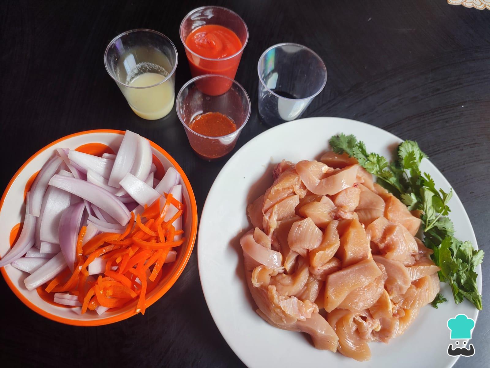 Para empezar con la receta de lomo saltado de pollo jugoso, primero corta la pechuga de pollo en pequeños dados o tiras. Seguido, pica también la cebolla roja en juliana o tiras ligeramente anchas, como bien puedes ver en la foto. A continuación, corta el ají amarillo en tiras y ten presente todos los demás ingredientes. No te tomará mucho tiempo terminar esta preparación.