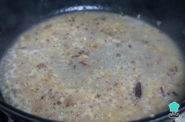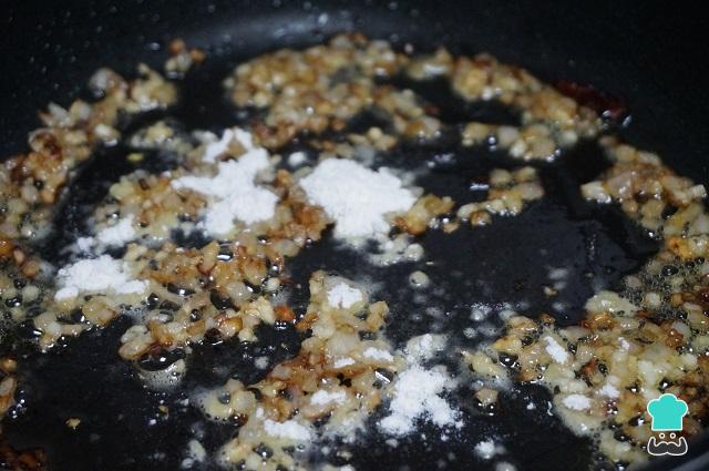 En la misma cazuela añadimos la cebolla y los ajos picados. Los doramos y cuando tengan un poco de color añadimos la cayena y la harina. Lo removemos para que se cocine la harina.