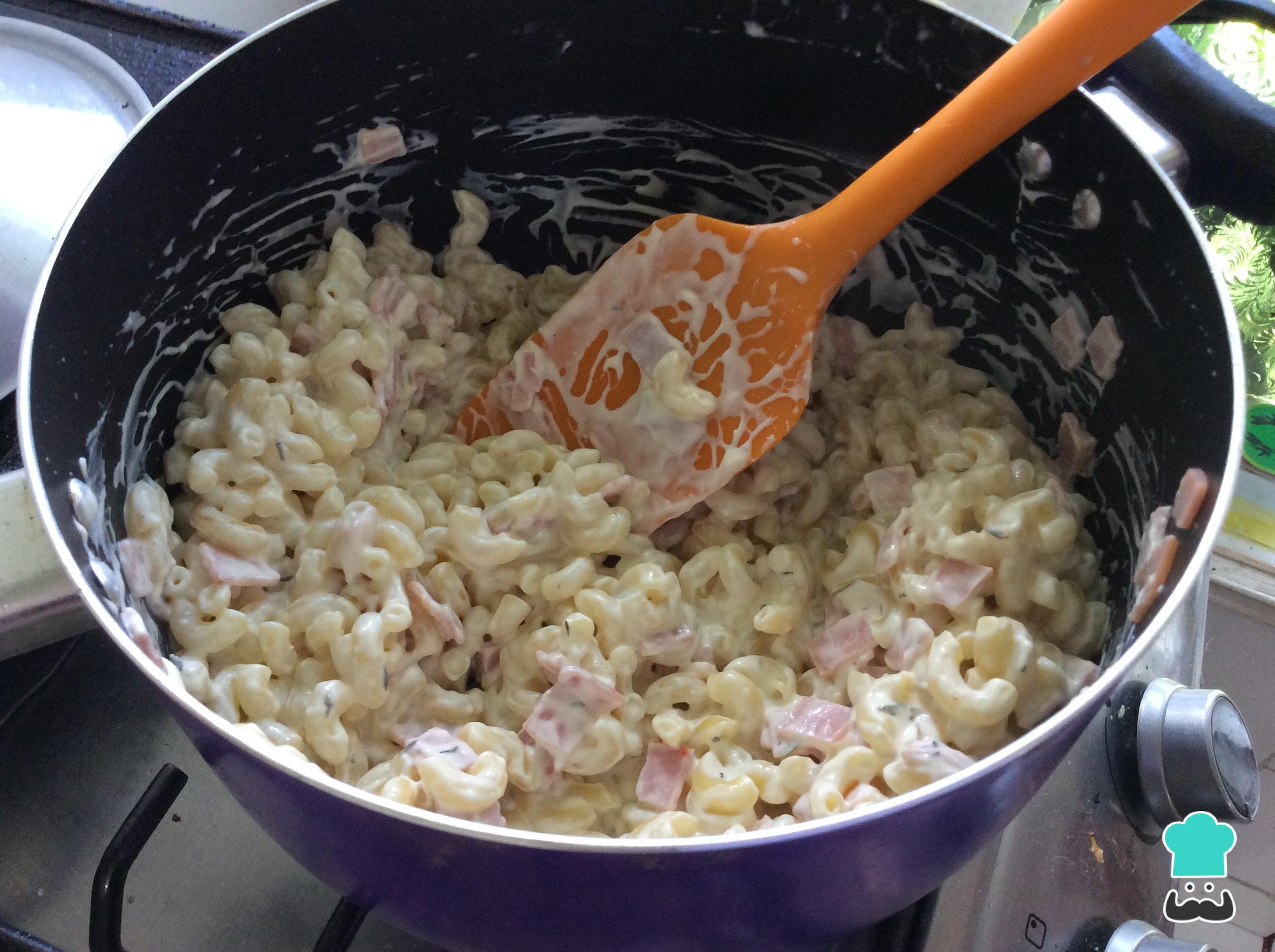 Pasados los 5 minutos de dorar el jamón, agrega los macarrones escurridos y también la crema agria y bate muy bien hasta integrar todos los ingredientes, pasados unos 3 minutos agrega el tomillo y mezcla.