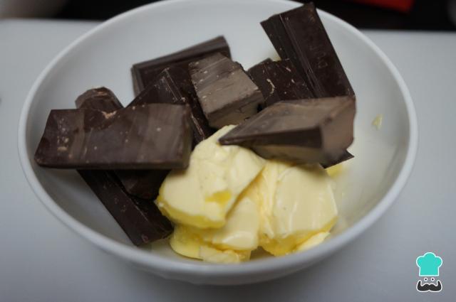 Coloca el chocolate y la mantequilla en un bol y funde a fuego lento, también puedes introducir 1 minuto a máxima potencia en el microondas. Retira y remueve y, si hace falta, incorpora unos segundos más hasta que se deshaga todo el chocolate.