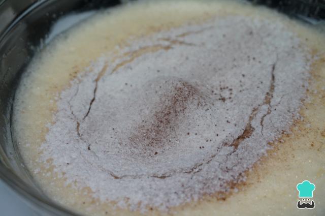 Mezcla la harina, las dos cucharas de cacao en polvo y la levadura. Tamiza y añade poco a poco a la mezcla de los huevos hasta que no queden grumos.