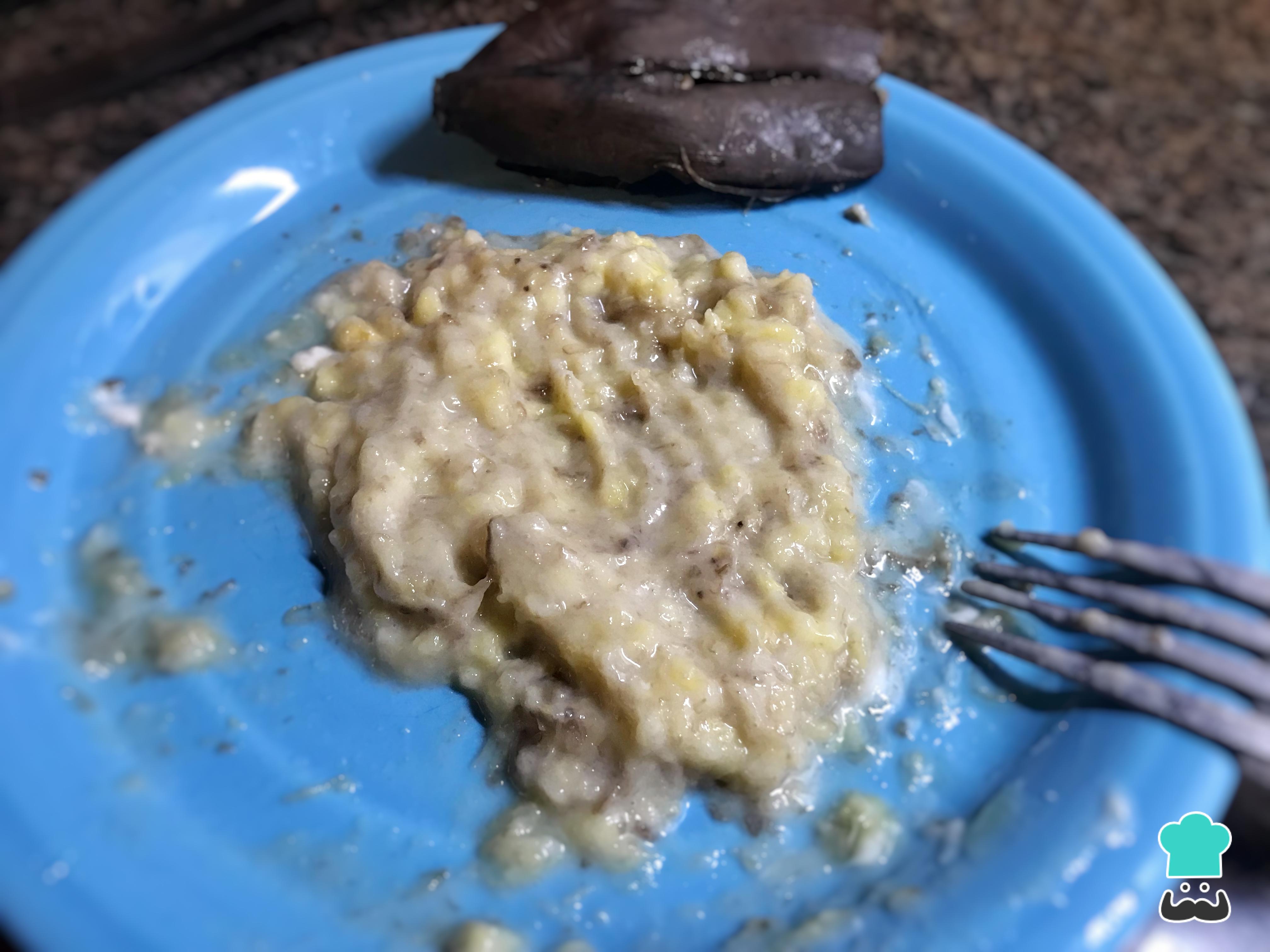 El primer paso para hacer la receta de las magdalenas al microondas es llevar la banana con la cáscara al horno, mientras preparas el resto de los pasos. La cáscara debe ponerse negra y, si estás usando la mitad, recomendamos que la lleves al horno sobre una placa para que no ensucie el fondo del horno. En la foto puedes observar qué tan oscura ha quedado la cáscara al calentarla en el horno. Cuando la tengas lista, písala con la miel y el queso. Resérvala.