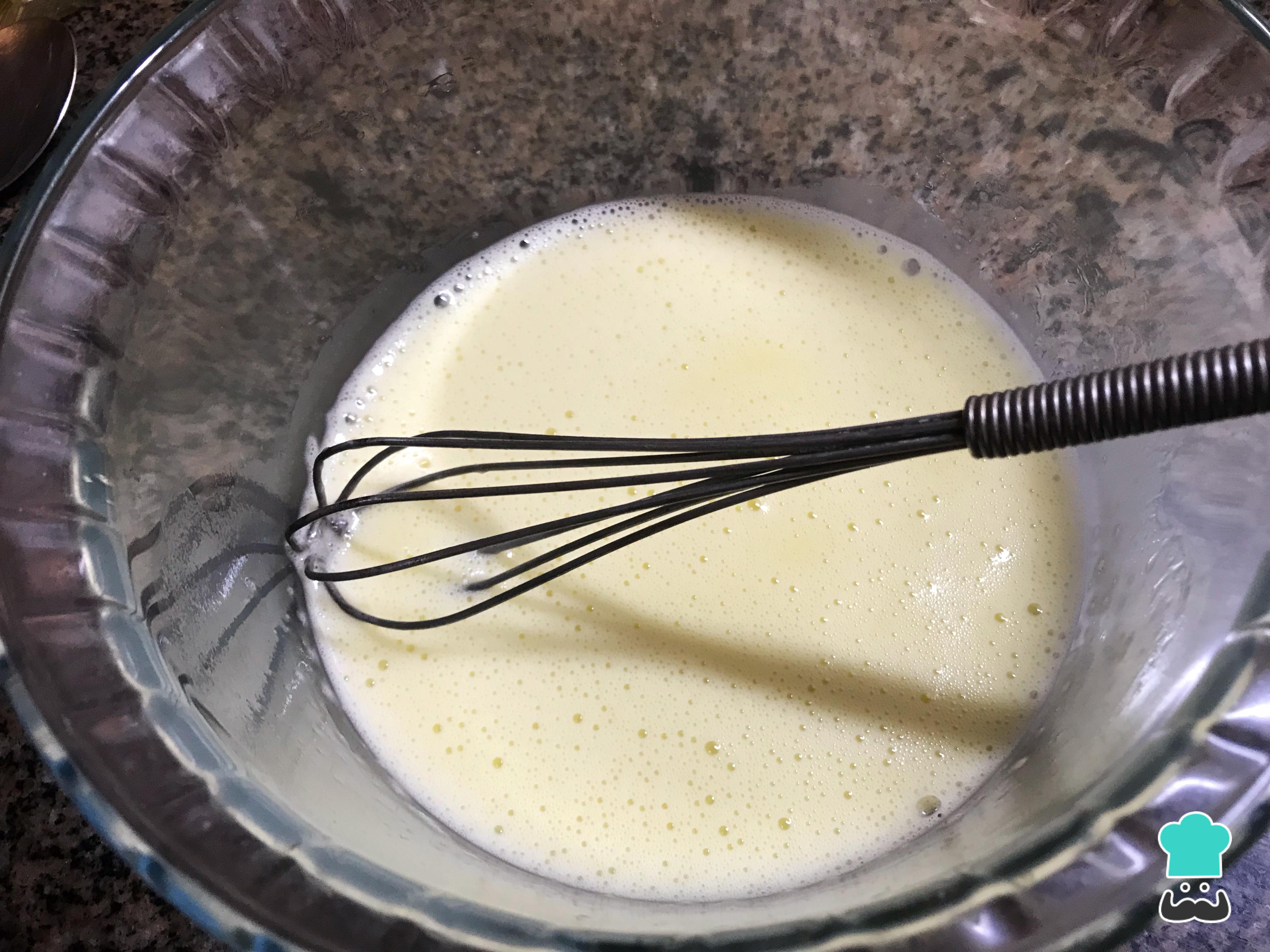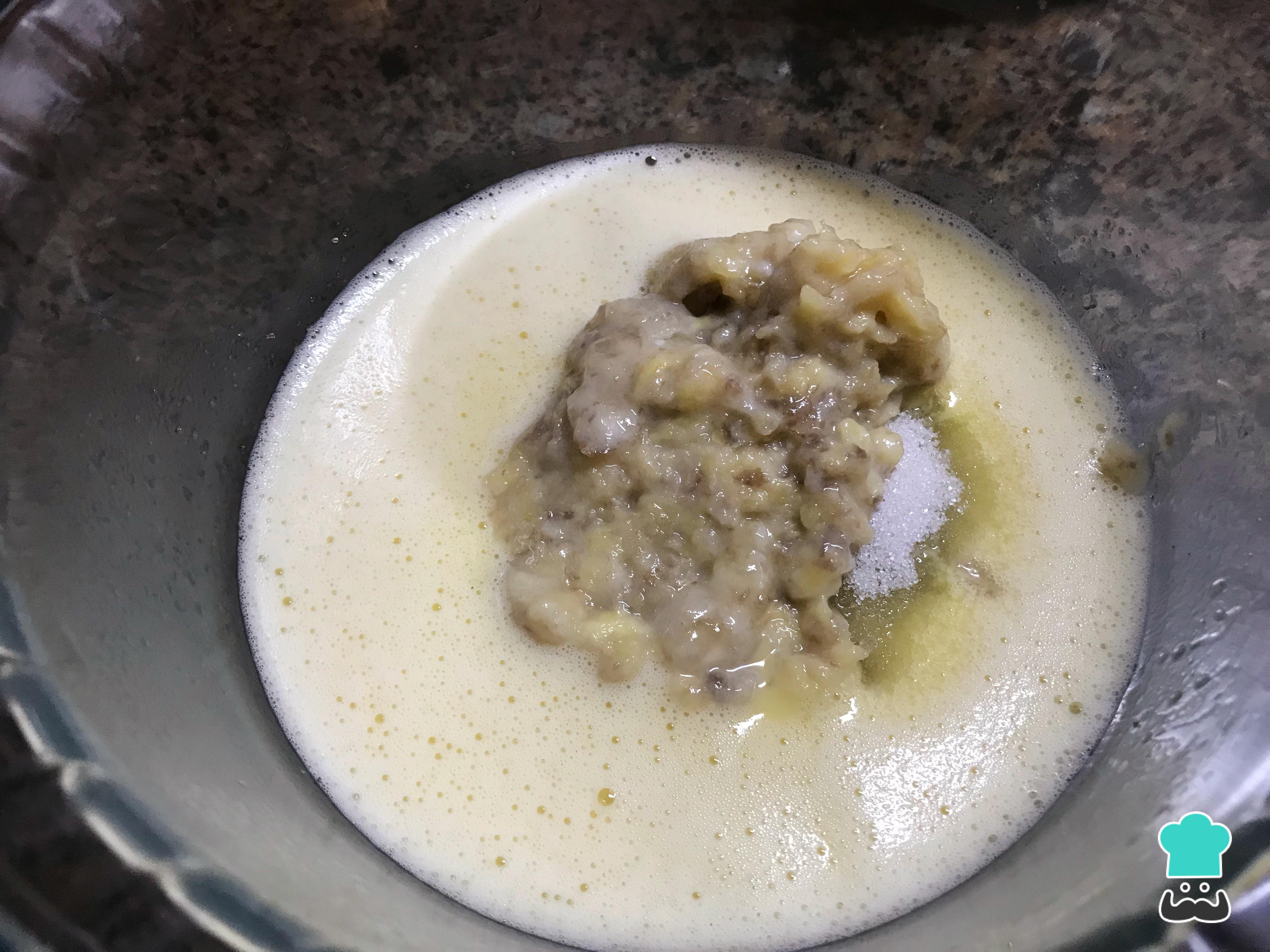 Añade el azúcar y la banana pisada. Seguido, bate la preparación un poco más.