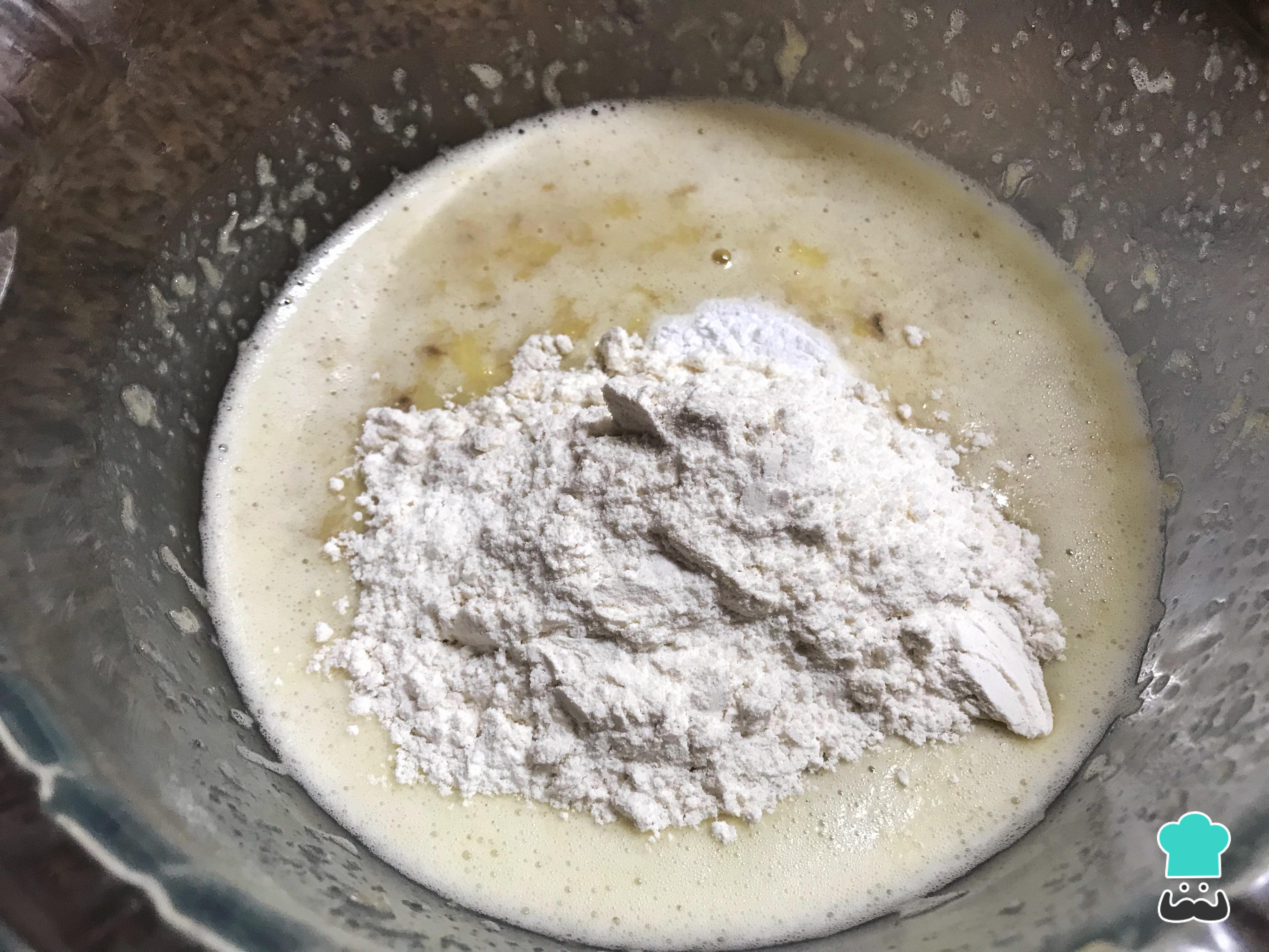 Incorpora la harina, el polvo de hornear y el bicarbonato de sodio previamente tamizados, con movimientos envolventes para evitar bajar el batido.