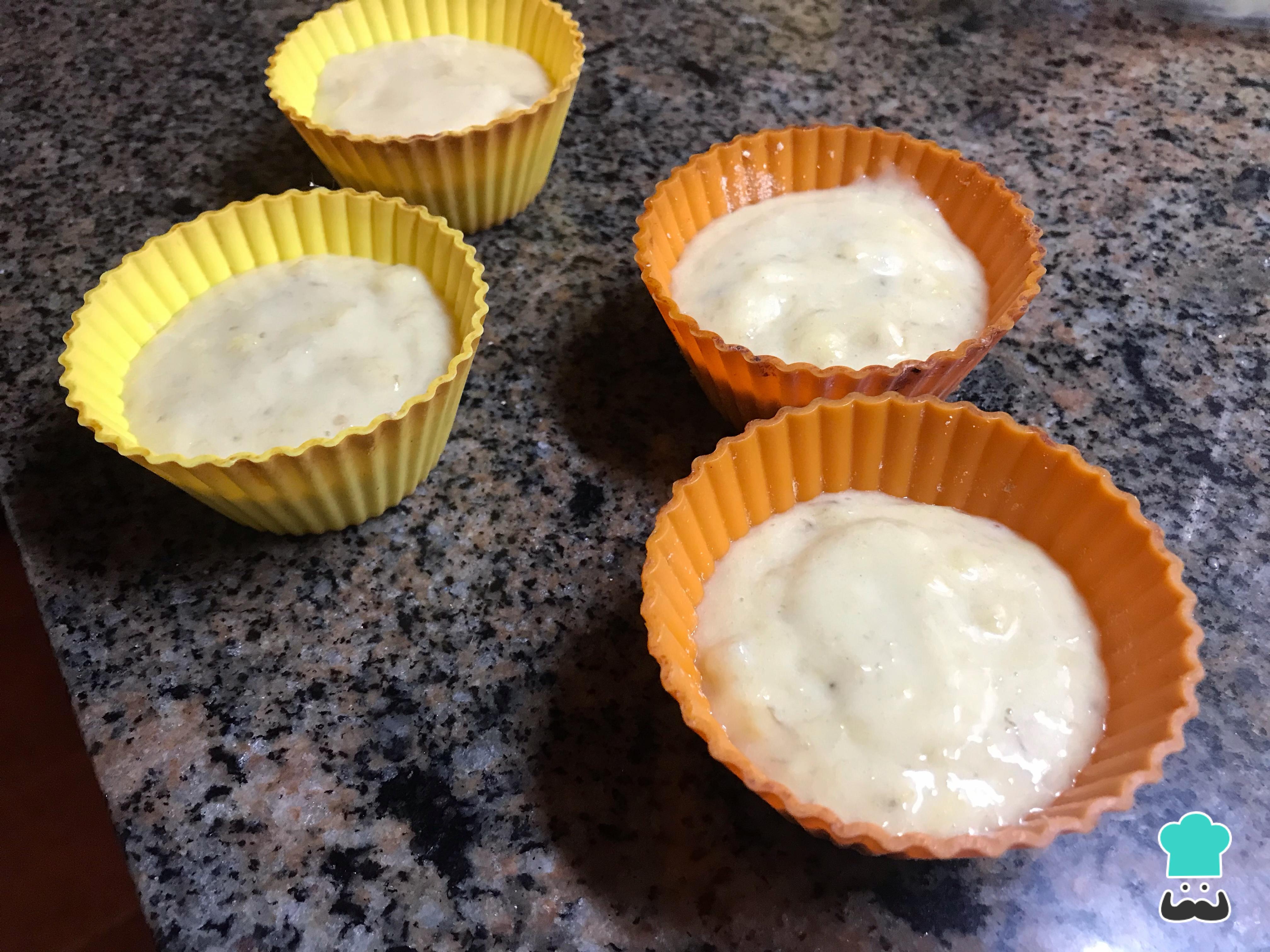 Distribuye la preparación entre los moldes aptos para microondas. Señalamos que pueden ser los de silicona, cerámica o vidrio, siempre que sean aptos para este tipo de cocción. Llénalos tres cuartos del molde. ¿Qué te está pareciendo esta receta de magdalenas en el microondas sin levadura?