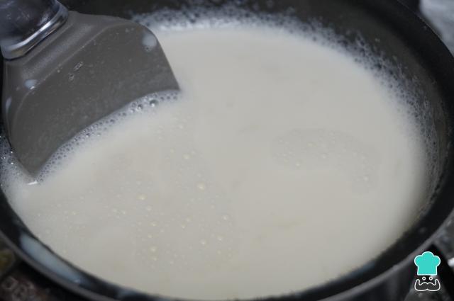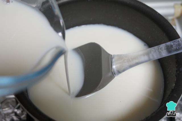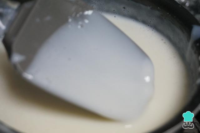 Ponemos un cazo con la mitad de la leche, añadimos el azúcar. Lo tendremos a fuego suave y removiendo para que se deshaga el azúcar. Cuando empiece a hervir retiramos del fuego.