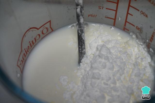 La otra mitad de la leche la tendremos en una jarra, iremos añadiendo la harina de maíz y removiendo hasta que quede toda bien disuelta.