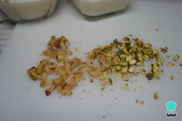 Ponemos unos pocos frutos secos por encima de las natillas, también se pueden poner a la hora de comerlas. Las metemos en la nevera 2-3 horas.
