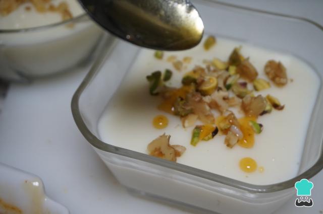 Pasado este tiempo solo queda servir las mahalabia libanesas con los frutos secos y un chorrito de miel. Pondremos poca miel y sacaremos el postre acompañado de más frutos secos y miel para que se sirva a su gusto cada comensal.