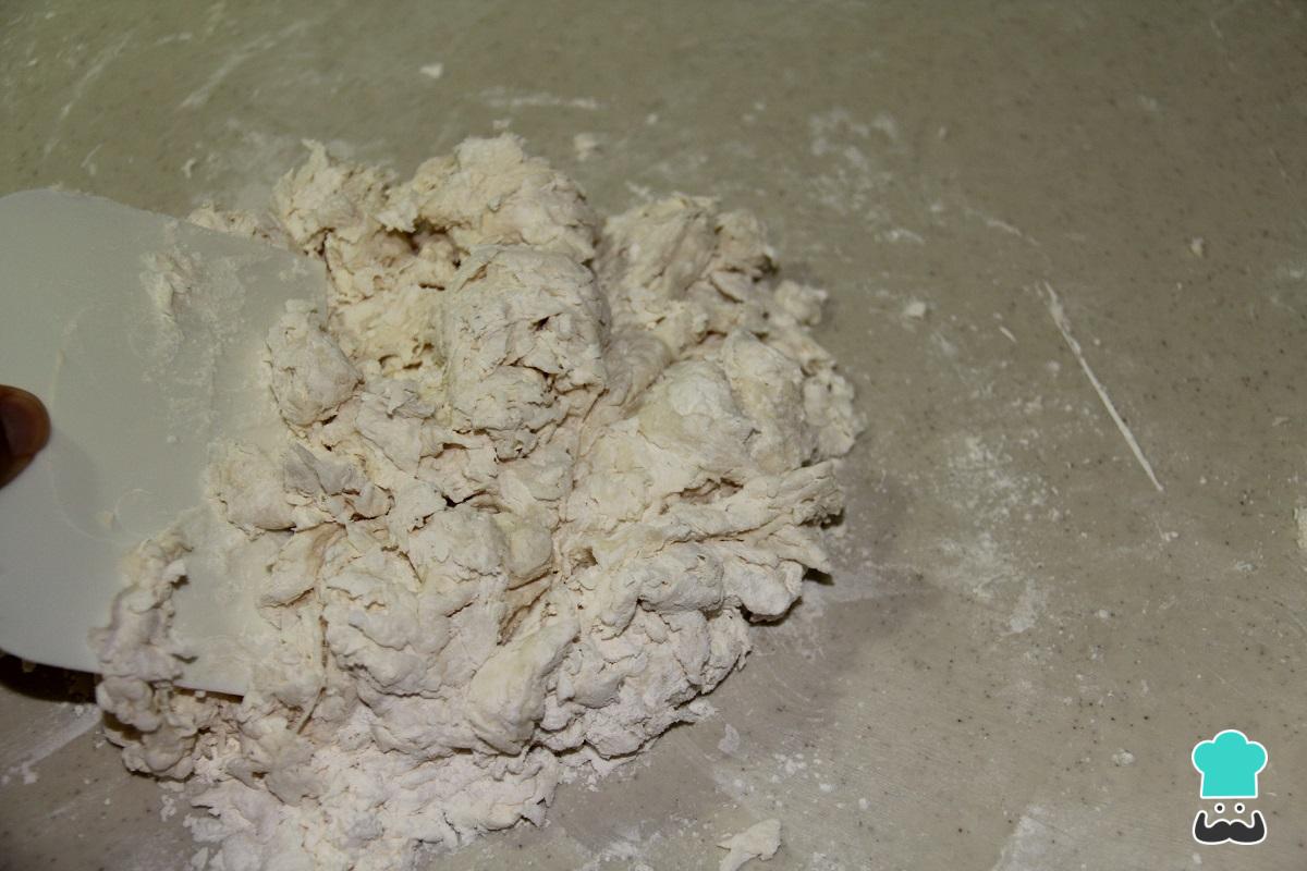 El primer paso para hacer una buena masa de hojaldre con mantequilla es amasar la harina con la manteca de cerdo. A medida que vamos amasando debemos ir añadiendo agua en pequeñas dosis, de esta forma nos aseguramos que la mezcla se integre correctamente.