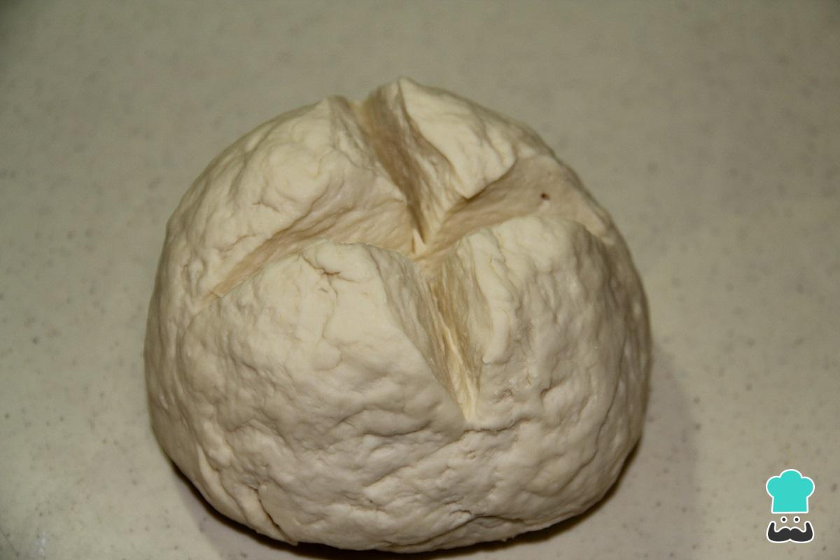Pasado este tiempo, retiramos el trapo y volvemos a amasar y reventar la masa, dejándola en forma de bloque. Procura que el centro del bloque quede un poco más grueso que los extremos, puesto que es ahí donde irá la mantequilla.
