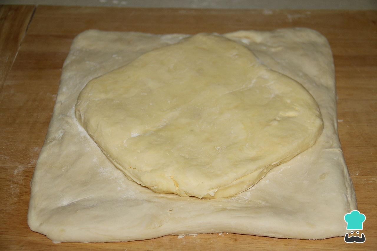 Lo que debemos hacer ahora es encerrar el bloque de mantequilla con la masa, como si se tratase de un sobre. Deja una punta libre para que la mantequilla salga a la superficie cuando procedamos a amasar el hojaldre.