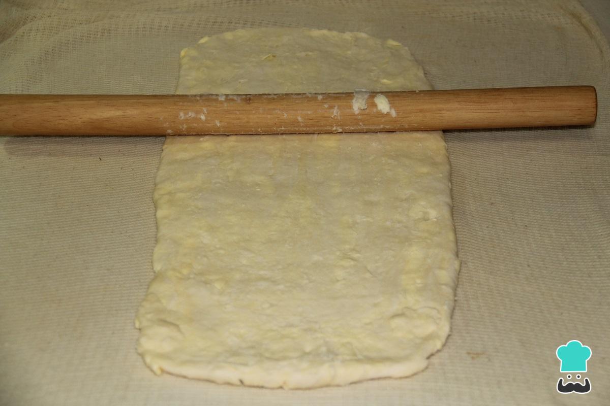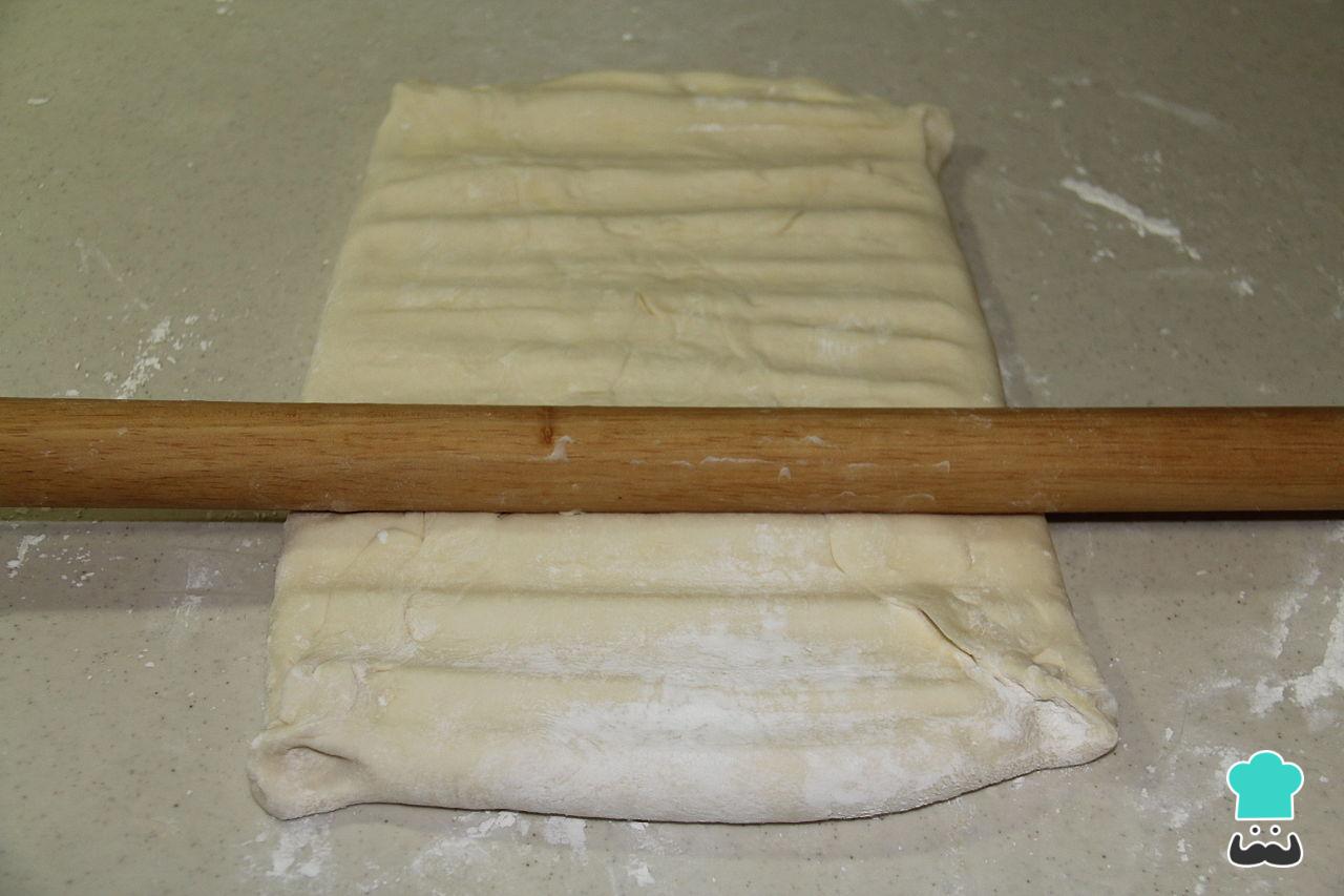 Cuando pase el tiempo de reposo, continuamos con la elaboración de nuestra masa de hojaldre con mantequilla Para ello, espolvoreamos bien con harina tanto la superficie de trabajo como el rodillo. Empezamos a estirar la masa del medio hacia a un lado y del medio hacia el otro. De esta forma nos aseguramos de repartir la materia grasa uniformemente.