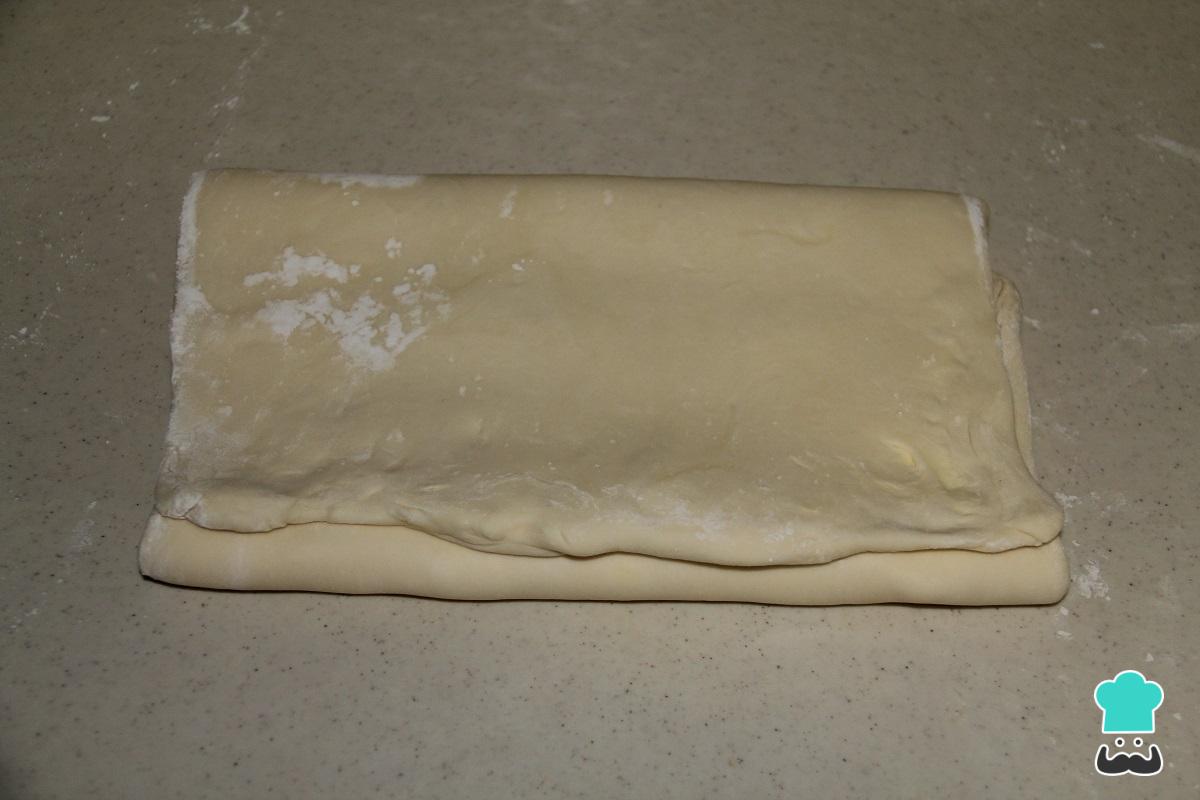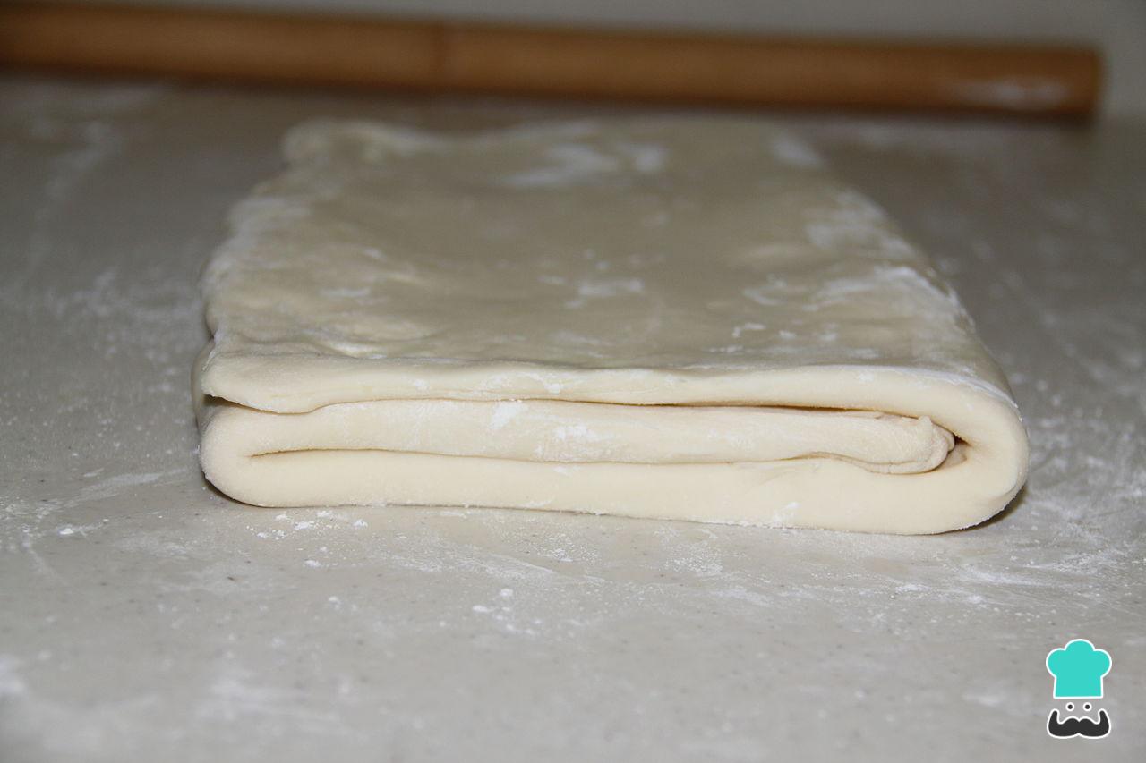 Ahora llega el momento de hacer los pliegues típicos del hojaldre. Para ello, dobla la masa sobre sí misma, primero hasta la mitad y luego completo, de forma que te queden tres capas. Realizados estos pliegues, dejaremos la masa del hojaldre con mantequilla reposar en el frigorífico durante 20 minutos.