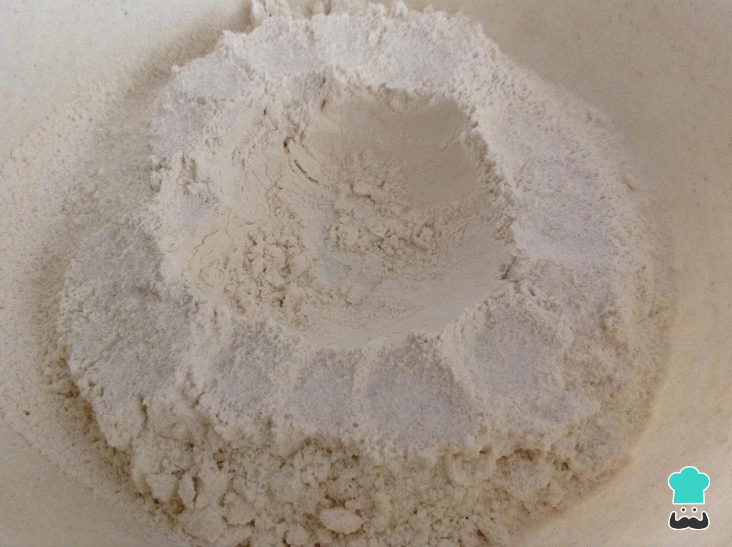 En un bol tamiza la harina de trigo, es decir, pásala por un colador para que la preparación y masa quede más fina. Luego, haz un arco en el bol para que podamos agregar el resto de los ingredientes en él. Adiciona alrededor de la harina la pizca de sal y azúcar.