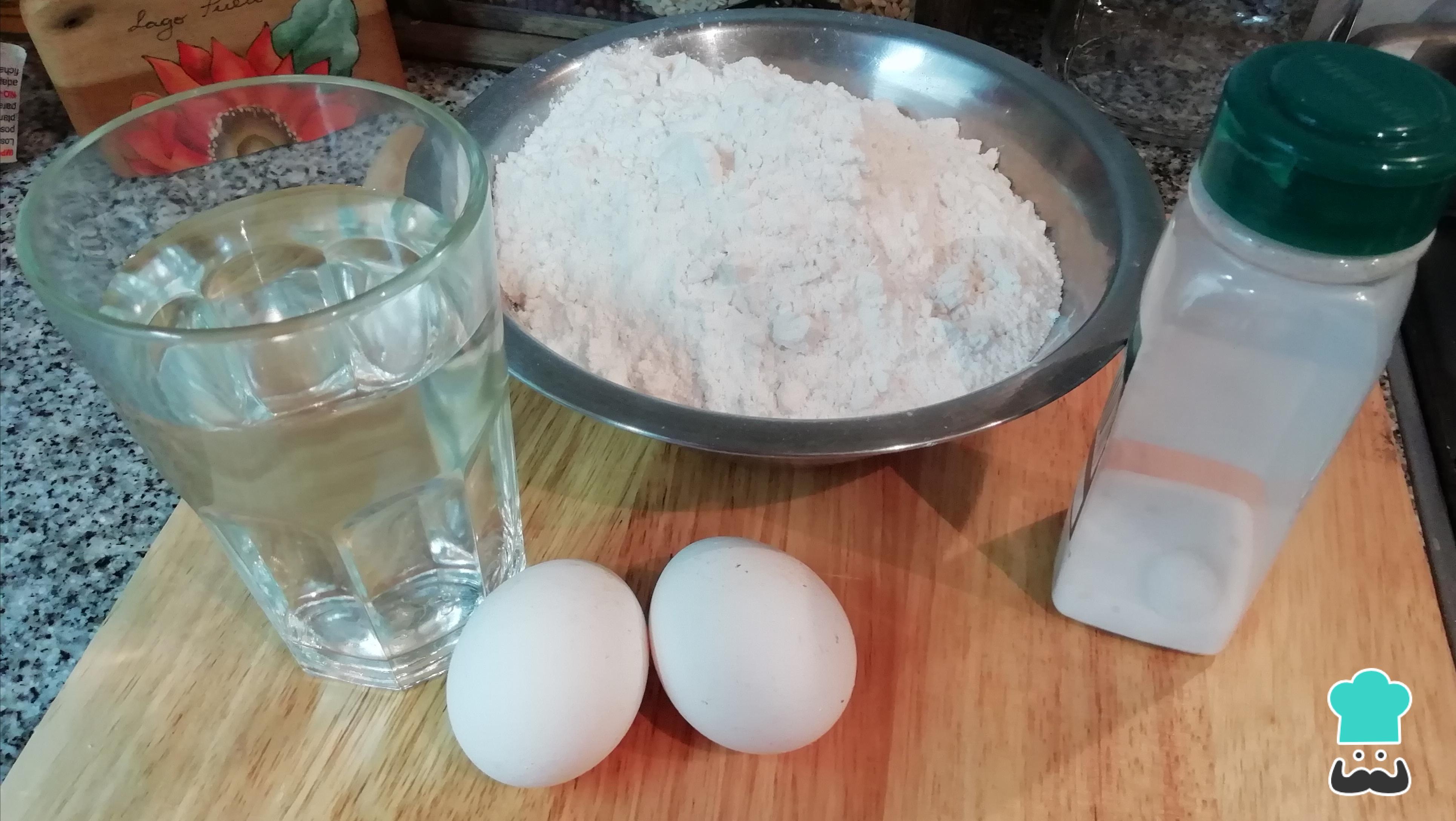 Cascamos los huevos y los ponemos junto con la harina, incorporamos la sal y, de a poco, vamos poniendo agua poco a poco y mezclando. Los ml de agua indicados son orientativos, ya que hay que añadir la cantidad que precise la harina.